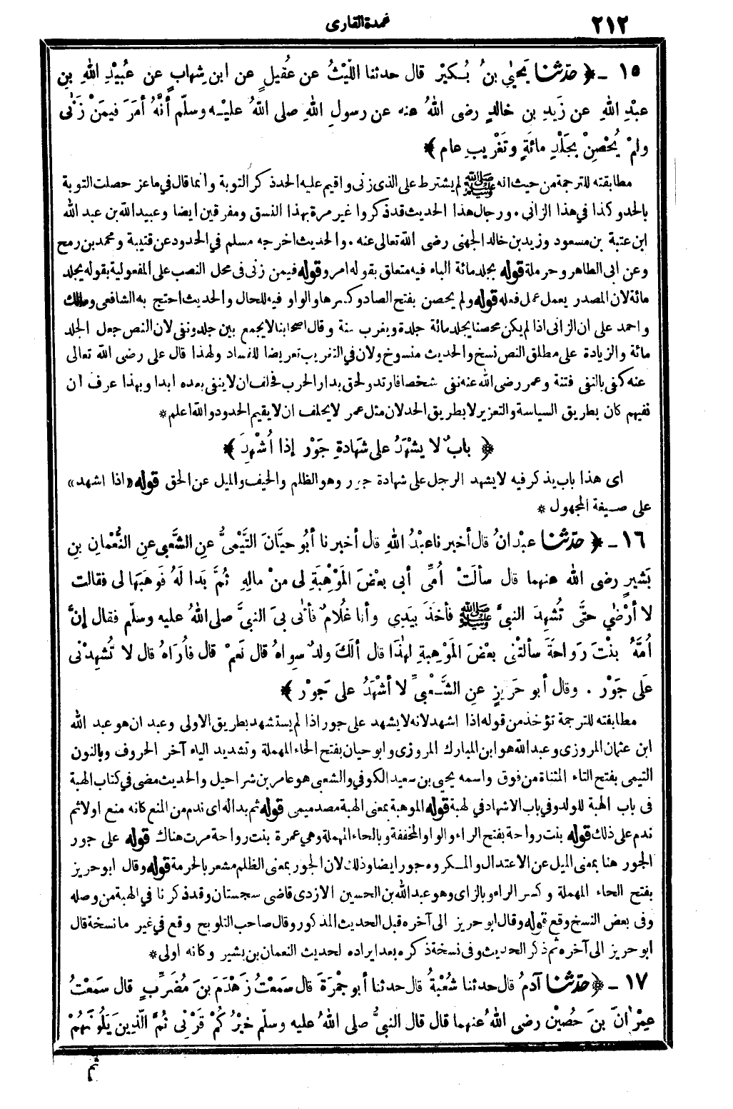 0562 - حدَّثنا عبْدَانُ قَالَ أخبرنَا عَبْدُ الله قَالَ أخبرنَا أبُو حَيَّانَ التَّيْمِيُّ عَنِ الشَّعْبِيِّ عنِ النُّعْمَانِ بنِ بَشيرٍ رَضِي الله تَعَالَى عنهُما قَالَ سألَتْ أُمِّي أبِي بَعْضَ الْمَوْهِبَةِ لِي مِنْ مالِهِ ثُمَّ بَدَا لَهُ فَوَهَبَهَا لِي فقالَت لَا أرْضاى حتَّى تُشْهِدَ النبيَّ صلى الله عَلَيْهِ وَسلم فأخَذَ بِيَدِي وأنَا غُلامٌ فأتاى بيَ النبيُّ صلى الله عَلَيْهِ وَسلم فَقَالَ إنَّ أُمَّهُ بنْتَ رَواحَةَ سألَتْنِي بَعْضَ الْمَوْهِبَةِ لِهاذا قَالَ ألَكَ ولَدٌ سِواهُ قَالَ نَعَمْ قَالَ فأُرَاهُ قَالَ لَا تُشْهِدْني عَلَى جَوْر. وَقَالَ أبُو حَرِيزٍ عنِ الشَّعْبِيِّ لَا أشْهَدُ على جَوْر.