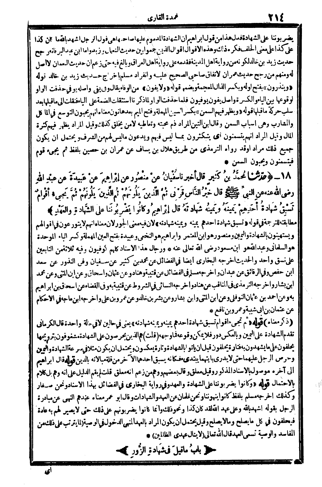 يضربوننا على الشَّهَادَة، فَدلَّ هَذَا من قَول إِبْرَاهِيم: أَن الشَّهَادَة المذموم عَلَيْهَا صَاحبهَا هِيَ قَول الرجل: أشهد بِاللَّه مَا كَانَ كَذَا على كَذَا، على معنى الْحلف، فكره ذَلِك، وَهَذِه الْأَقْوَال أَقْوَال الَّذين جمعُوا بَين حَدِيث النُّعْمَان وَزيد. وَأما ابْن عبد الْبر فَإِنَّهُ رجح حَدِيث زيد بن خَالِد لكَونه من رِوَايَة أهل الْمَدِينَة، فقدمه على رِوَايَة أهل الْعرَاق، وَبَالغ فِيهِ حَتَّى زعم أَن حَدِيث النُّعْمَان لَا أصل لَهُ، وَمِنْهُم من رجح حَدِيث عمرَان، لِاتِّفَاق صَاحِبي (الصَّحِيح) عَلَيْهِ، وانفراد مُسلم بِإِخْرَاج حَدِيث زيد بن خَالِد، قَوْله: (وينذرون) ، بِفَتْح أَوله وبكسر الذَّال الْمُعْجَمَة وَبِضَمِّهَا. قَوْله: (وَلَا يفون) من الْوَفَاء، يُقَال: وَفِي يَفِي وَأَصله، يُوفي، حذفت الْوَاو لوقوعها بَين الْيَاء والكسرة، وأصل: يفون، يوفيون، فَلَمَّا حذفت الْوَاو وَلما ذكرنَا استثقلت الضمة على الْيَاء فنقلت إِلَى مَا قبلهَا بعد سلب حَرَكَة مَا قبلهَا. قَوْله: (وَيظْهر فيهم السّمن) ، بِكَسْر السِّين الْمُهْملَة وَفتح الْمِيم بعْدهَا نون، مَعْنَاهُ: أَنهم يحبونَ التَّوَسُّع فِي المآكل والمشارب، وَهِي أَسبَاب السّمن. وَقَالَ ابْن التِّين: المُرَاد ذمّ محبته وتعاطيه لَا مَن يخلق كَذَلِك. وَقيل: المُرَاد، يظْهر فيهم كَثْرَة المَال، وَقيل: المُرَاد أَنهم يتسمنون أَي: يتكثرون بِمَا لَيْسَ فيهم، وَيدعونَ مَا لَيْسَ لَهُم من الشّرف، وَيحْتَمل أَن يكون جَمِيع ذَلِك مرَادا، وَقد رَوَاهُ التِّرْمِذِيّ من طَرِيق هِلَال بن يسَاف عَن عمرَان بن حُصَيْن بِلَفْظ: ثمَّ يَجِيء قوم فيتسمنون وَيُحِبُّونَ السّمن.