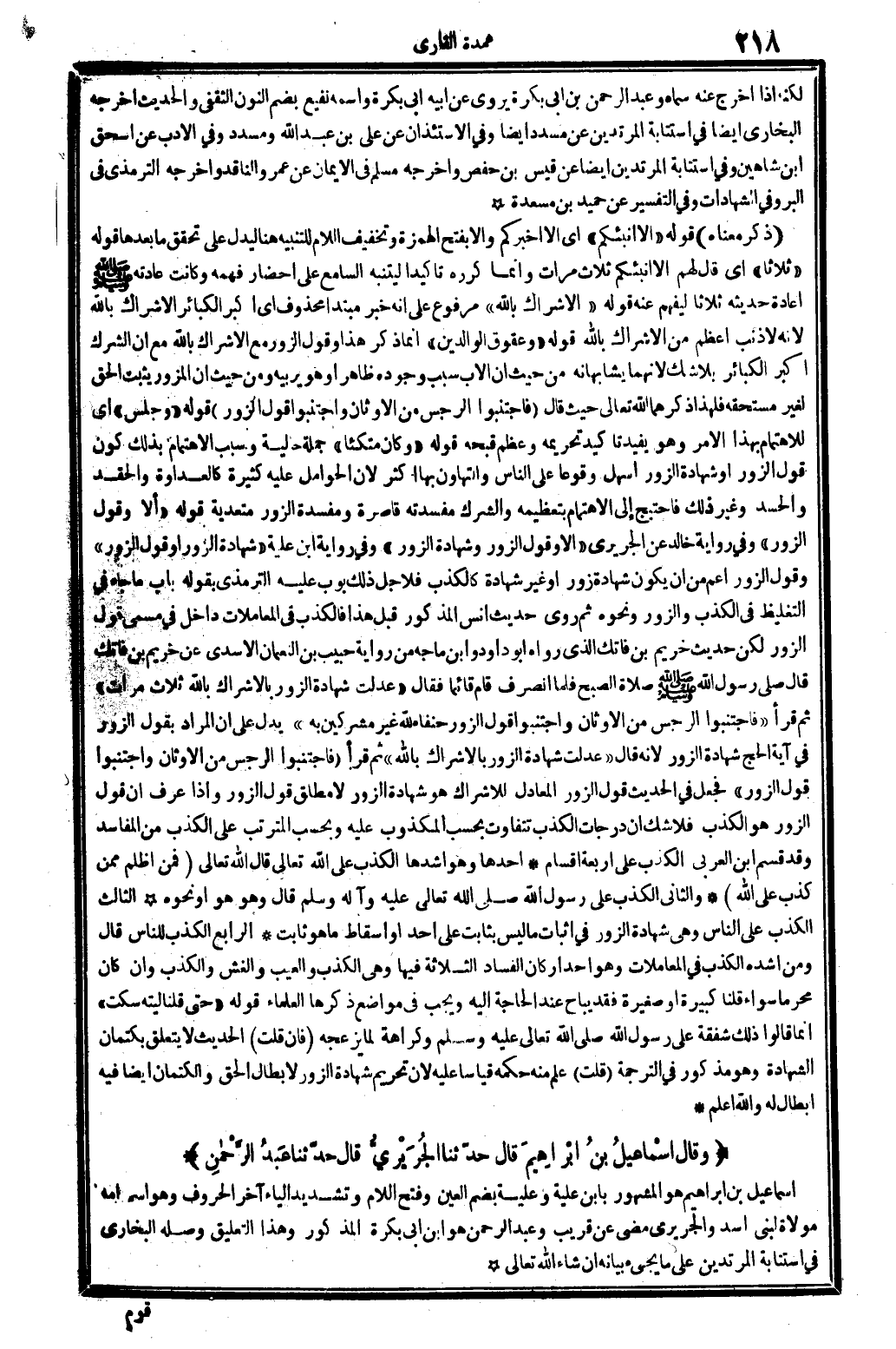 ذكر مَعْنَاهُ: قَوْله: (أَلا أنبئكم) أَي: أَلا أخْبركُم، وألاَ، بِفَتْح الْهمزَة وَتَخْفِيف اللَّام، للتّنْبِيه هُنَا ليدل على تحقق مَا بعْدهَا. قَوْله: (ثَلَاثًا) أَي: قَالَ لَهُم: (ألاَ أنبئكم) ثَلَاث مَرَّات، وَإِنَّمَا كَرَّرَه تَأْكِيدًا ليتنبه السَّامع على إِحْضَار فهمه، وَكَانَت عَادَته صلى الله عَلَيْهِ وَسلم إِعَادَة حَدِيثه ثَلَاثًا ليفهم عَنهُ. قَوْله: (الْإِشْرَاك بِاللَّه) ، مَرْفُوع على أَنه خبر مُبْتَدأ مَحْذُوف أَي: أكبر الْكَبَائِر الْإِشْرَاك بِاللَّه، لِأَنَّهُ لَا ذَنْب أعظم من الْإِشْرَاك بِاللَّه. قَوْله: (وعقوق الْوَالِدين) ، إِنَّمَا ذكر هَذَا (وَقَول الزُّور) مَعَ الْإِشْرَاك بِاللَّه، مَعَ أَن الشّرك أكبر الْكَبَائِر بِلَا شكّ لِأَنَّهُمَا يشابهانه من حَيْثُ إِن الْأَب سَبَب وجوده ظَاهرا وَهُوَ يرِيبهُ، وَمن حَيْثُ إِن المزور يثبت الْحق لغير مُسْتَحقّه، فَلهَذَا ذكرهمَا الله تَعَالَى حَيْثُ قَالَ: {فَاجْتَنبُوا الرجس من الْأَوْثَان وَاجْتَنبُوا قَول الزُّور} (الْحَج: 03) . قَوْله: (وَجلسَ) أَي: للاهتمام بِهَذَا الْأَمر، وَهُوَ يفيدنا تَأْكِيد تَحْرِيمه وَعظم قبحه. قَوْله: (وَكَانَ مُتكئا) ، جملَة حَالية. وَسبب الإهتمام بذلك كَون قَول الزُّور أَو شَهَادَة الزُّور أسهل وقوعاً على النَّاس، والتهاون بهَا أَكثر، لِأَن الْحَوَامِل عَلَيْهِ كَثِيرَة: كالعداوة والحقد والحسد ... وَغير ذَلِك، فاحتيج إِلَى الإهتمام بتعظيمه، والشرك مفسدته قَاصِرَة، ومفسدة الزُّور متعدية. قَوْله: (ألاَ وَقَول الزُّور) ، وَفِي رِوَايَة خَالِد عَن الْجريرِي: (أَلا وَقَول الزُّور، وَشَهَادَة الزُّور) . وَفِي رِوَايَة ابْن علية: (شَهَادَة الزُّور أَو قَول الزُّور) . وَقَول الزُّور أَعم من أَن يكون شَهَادَة زور أَو غير شَهَادَة، كالكذب، فلأجل ذَلِك بوب عَلَيْهِ التِّرْمِذِيّ بقوله: بَاب مَا جَاءَ فِي التَّغْلِيظ فِي الْكَذِب والزور، وَنَحْوه. ثمَّ روى حَدِيث أنس الْمَذْكُور قبل هَذَا، فالكذب فِي الْمُعَامَلَات دَاخل فِي مُسَمّى قَول الزُّور، لَكِن حَدِيث خريم بن فاتك الَّذِي رَوَاهُ أَبُو دَاوُد وَابْن مَاجَه من رِوَايَة حبيب بن النُّعْمَان الْأَسدي عَن خريم بن فاتك. قَالَ: صلى رَسُول الله، صلى الله عَلَيْهِ وَسلم صَلَاة الصُّبْح، فَلَمَّا انْصَرف قَامَ قَائِما فَقَالَ: (عدلت شَهَادَة الزُّور بالإشراك بِاللَّه، ثَلَاث مَرَّات) . ثمَّ قَرَأَ: {فَاجْتَنبُوا الرجس من الْأَوْثَان وَاجْتَنبُوا قَول الزُّور حنفَاء لله غير مُشْرِكين بِهِ} (الْحَج: 03) . يدل على أَن المُرَاد بقول الزُّور فِي آيَة الْحَج: شَهَادَة الزُّور، لِأَنَّهُ قَالَ: (عدلت شَهَادَة الزُّور بالإشراك بِاللَّه) ثمَّ قَرَأَ: {فَاجْتَنبُوا الرجس من الْأَوْثَان وَاجْتَنبُوا قَول الزُّور} (الْحَج: 03) . فَجعل فِي الحَدِيث قَول الزُّور المعادل للإشراك هُوَ شَهَادَة الزُّور، لَا مُطلق قَول الزُّور، وَإِذا عرف أَن قَول الزُّور هُوَ الْكَذِب. فَلَا شكّ أَن دَرَجَات الْكَذِب تَتَفَاوَت بِحَسب المكذوب عَلَيْهِ، وبحسب الْمُتَرَتب على الْكَذِب من الْمَفَاسِد. .
