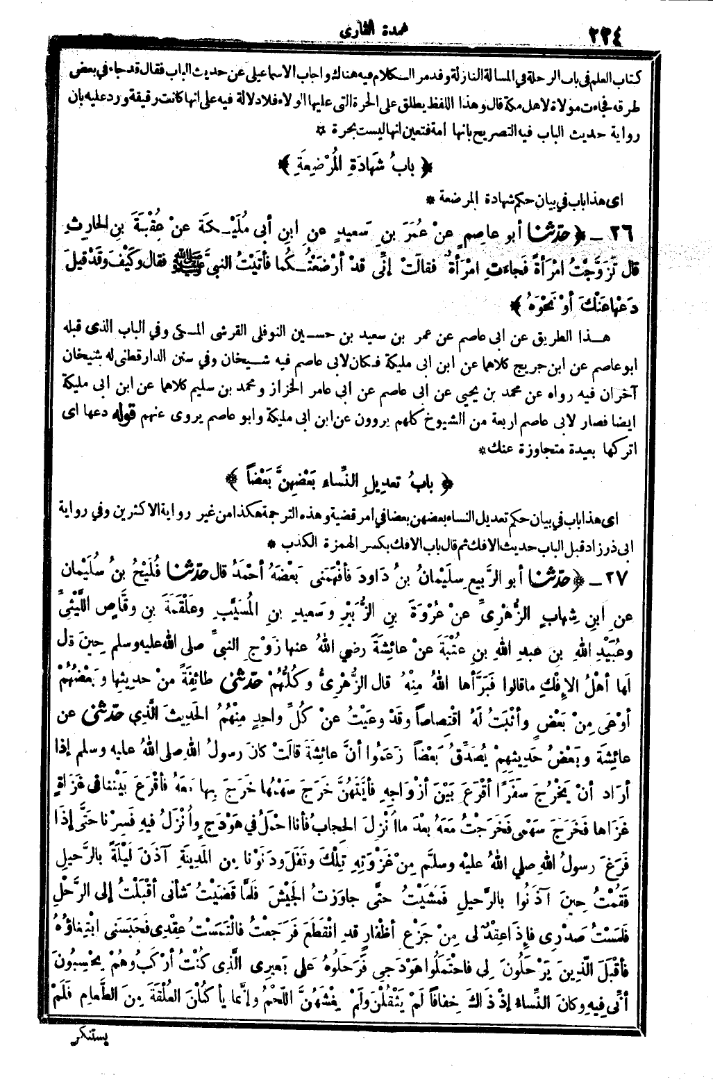 1662 - حدَّثنا أبُو الرَّبِيعِ سلَيْمَانُ بنُ دَاوُدَ فأفْهَمَنِي بَعْضَهُ أحْمدُ قَالَ حدَّثنا فُلَيْحُ بنُ سُلَيْمان عنِ ابنِ شِهَابٍ الزُّهْرِيِّ عنْ عُرْوَةَ بنِ الزُّبَيْرِ وسَعِيدِ بنِ الْمُسَيَّبِ وعَلْقَمَةَ بنِ وَقَّاصٍ اللَّيْثِي وعُبَيْدِ الله بنِ عبْدِ الله بنِ عُتْبَةَ عنْ عَائِشَةَ رَضِي الله تَعَالَى عَنْهَا زَوْجِ النبيِّ صلى الله عَلَيْهِ وَسلم حِينَ قالَ لَهَا أهْلُ الأفْكِ مَا قالُوا فَبَرَّأهَا الله مِنْهُ قَالَ الزُّهْرِيُّ وكُلُّهُمْ حدَّثنِي طائِفَةً مِنْ حَدِيثِهَا وبَعْضُهُمْ أوْعاى مِنْ بَعْضٍ وأثْبَتُ لَهُ اقْتِصَاصاً وقَدْ وعَيْتُ عنْ كُلِّ واحِدٍ مِنْهُمُ الحَدِيثَ الَّذِي حدَّثني عَن عائِشَةَ وبَعْضُ حَدِيثِهِمْ يُصَدِّقُ بَعْضاً زَعَمُوا أنَّ عائِشَةَ قالَتْ كانَ رسُولُ الله صلى الله عَلَيْهِ وَسلم إذَا أرَادَ أنْ يَخْرُجَ سَفَرَاً أقْرَعَ بَيْنَ أزْوَاجِهِ فأيَّتَهُنَّ خَرَجَ سَهمُهَا خَرَجَ بِها معَهُ فأقْرَعَ بَيْنن فِي غَزاةٍ غَزاهَا فَخرَجَ سَهْمِي فَخَرَجْتُ معَهُ بَعْدَ مَا أُنْزِلَ الحِجَابُ فَأَنا أحْمَلُ فِي هَوْدَجً وأُنْزَلُ فِيهه فَسِرْنَا حتَّى إذَا فَرَغَ رَسُولُ الله صلى الله عَلَيْهِ وَسلم مِنْ غَزْوَتِهِ تِلْكَ وقَفَلَ ودَنَوْنَا مِنَ المَدِينَةِ آذَنَ لَيْلَةً بالرَّحِيلِ فَقُمْتُ حِينَ آذَنُوا بالرَّحِيلِ فَمَشَيْتُ حتَّى جاوَزْتُ الجَيْشَ فلَمَّا قَضَيْتُ شَأنِي أقْبَلْتُ إِلَى الرَّحْلِ فلَمَسْتُ صَدْرِي فإذَا عِقْدٌ لِي مِنْ جَزْع أظْفارً قدِ انْقَطَعَ فرَجَعْتُ فالْتَمَسْتُ عِقْدِي فحَبَسَني ابْتِغَاؤهُ فأقْبَلَ الَّذِينَ يَرْحَلُونَ لِي فاحْتَمَلُوا هَوْدَجِي فرَحَلُوهُ عَلى بَعيري الَّذِي كُنْتُ أرْكَبُ وهُمْ يَحْسُبونَ أنِّي فِيهِ وكانَ النِّسَاءُ إذْ ذَاكَ خِفافاً لَمْ يَثْقُلْنَ ولَمْ يَغْشَهُنَّ اللَّحْمُ وإنَّمَا يأكُلْنَ العُلْقَةَ مِنَ الطَّعامِ فَلَمْ