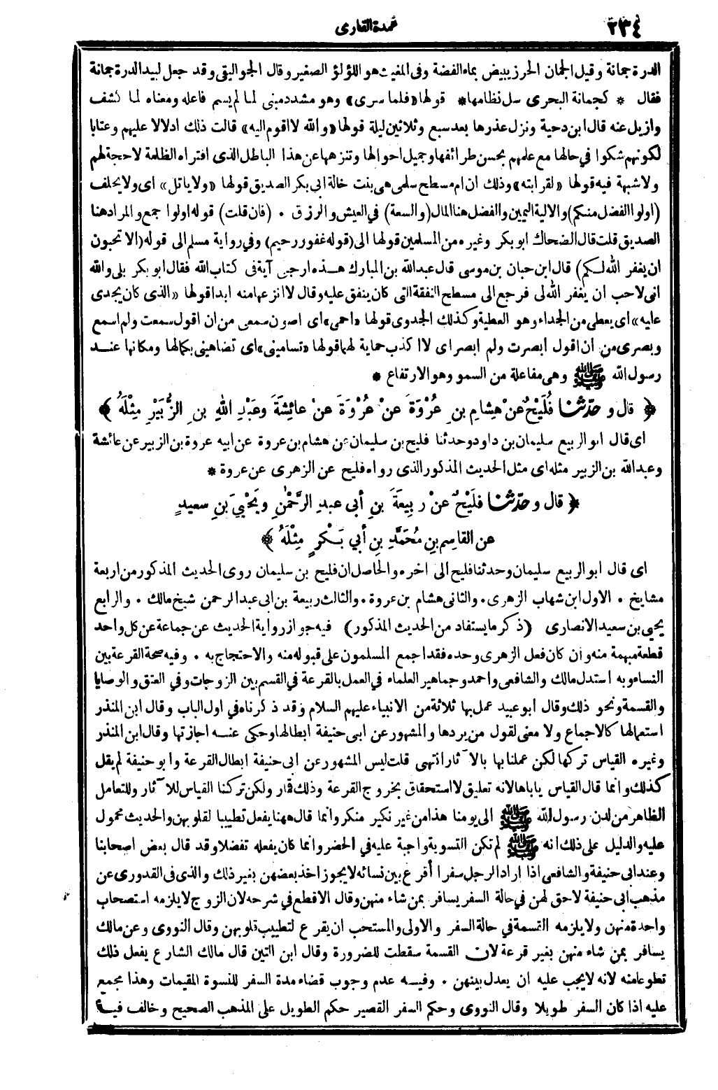 ذكر مَا يُسْتَفَاد من الحَدِيث الْمَذْكُور: فِيهِ: جَوَاز رِوَايَة الحَدِيث عَن جمَاعَة، عَن كل وَاحِد قِطْعَة مُبْهمَة مِنْهُ، وَإِن كَانَ فعل الزُّهْرِيّ وَحده فقد أجمع الْمُسلمُونَ على قبُوله مِنْهُ والاحتجاج بِهِ. وَفِيه: صِحَة الْقرعَة بَين النِّسَاء، وَبِه اسْتدلَّ مَالك وَالشَّافِعِيّ وَأحمد وجماهير الْعلمَاء فِي الْعَمَل بِالْقُرْعَةِ: فِي الْقسم بَين الزَّوْجَات، وَفِي الْعتْق والوصايا وَالْقِسْمَة وَنَحْو ذَلِك، وَقَالَ أَبُو عبيد: عمل بهَا ثَلَاثَة من الْأَنْبِيَاء، عَلَيْهِم السَّلَام، وَقد ذَكرْنَاهُ فِي أول الْبَاب. وَقَالَ ابْن الْمُنْذر: اسْتِعْمَالهَا كالإجماع وَلَا معنى لقَوْل من يردهَا، وَالْمَشْهُور عَن أبي حنيفَة، إِبْطَالهَا، وَحكي عَنهُ إجازتها. وَقَالَ ابْن الْمُنْذر وَغَيره: الْقيَاس تَركهَا، لَكِن عَملنَا بهَا بالآثار. انْتهى. قلت: لَيْسَ الْمَشْهُور عَن أبي حنيفَة إبِْطَال الْقرعَة، وَأَبُو حنيفَة لم يقل كَذَلِك، وَإِنَّمَا قَالَ: الْقيَاس يأباها، لِأَنَّهُ تَعْلِيق لَا اسْتِحْقَاق بِخُرُوج الْقرعَة، وَذَلِكَ قمار، وَلَكِن تركنَا الْقيَاس للآثار وللتعامل الظَّاهِر من لدن رَسُول الله، صلى الله عَلَيْهِ وَسلم إِلَى يَوْمنَا هَذَا من غير نَكِير مُنكر، وَإِنَّمَا قَالَ هَهُنَا: يفعل تطييباً لقلوبهن، والْحَدِيث مَحْمُول عَلَيْهِ، وَالدَّلِيل على ذَلِك أَنه صلى الله عَلَيْهِ وَسلم لم تكن التَّسْوِيَة وَاجِبَة عَلَيْهِ فِي الْحَضَر، وَإِنَّمَا كَانَ يَفْعَله تفضلاً، وَقد قَالَ بعض أَصْحَابنَا: وَعند أبي حنيفَة وَالشَّافِعِيّ إِذا أَرَادَ الرجل سفرا أَقرع بَين نِسَائِهِ، لَا يجوز أَخذ بَعضهنَّ بِغَيْر ذَلِك، وَالَّذِي فِي الْقَدُورِيّ: عَن مَذْهَب أبي حنيفَة: لَا حقَّ لَهُنَّ فِي حَالَة السّفر يُسَافر بِمن شَاءَ مِنْهُنَّ، وَقَالَ الأقطع فِي (شَرحه) : لِأَن الزَّوْج لَا يلْزمه اسْتِصْحَاب وَاحِدَة مِنْهُنَّ وَلَا يلْزمه الْقِسْمَة فِي حَالَة السّفر، وَالْأولَى وَالْمُسْتَحب أَن يقرع لتطييب قلوبهن. وَقَالَ النَّوَوِيّ: وَعَن مَالك: يُسَافر بِمن شَاءَ مِنْهُنَّ بِغَيْر قرعَة، لِأَن الْقِسْمَة سَقَطت للضَّرُورَة. وَقَالَ ابْن التِّين: قَالَ مَالك: الشَّارِع يفعل ذَلِك تَطَوّعا مِنْهُ لِأَنَّهُ لَا يجب عَلَيْهِ أَن يعدل بَينهُنَّ. وَفِيه: عدم وجوب قَضَاء مُدَّة السّفر للنسوة المقيمات، وَهَذَا مجمع عَلَيْهِ إِذا كَانَ السّفر طَويلا. وَقَالَ النَّوَوِيّ: وَحكم السّفر الْقصير حكم الطَّوِيل على الْمَذْهَب الصَّحِيح، وَخَالف فِيهِ
