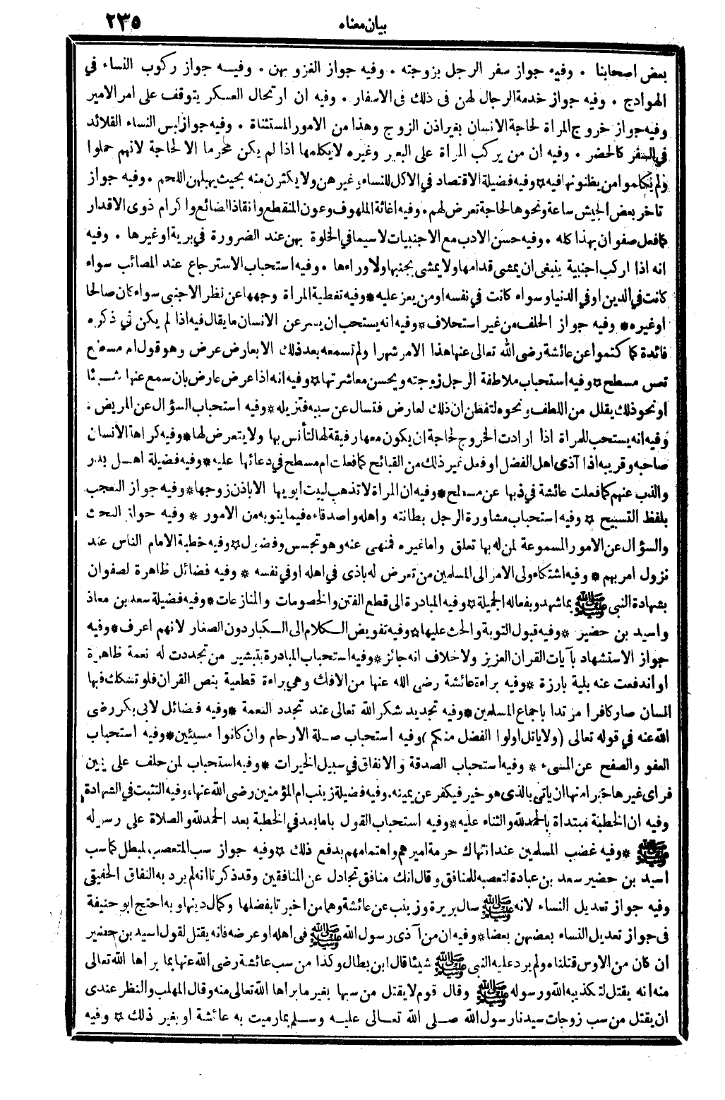 بعض أَصْحَابنَا. وَفِيه: جَوَاز سفر الرجل بِزَوْجَتِهِ. وَفِيه: جَوَاز الْغَزْو بِهن. وَفِيه: جَوَاز ركُوب النِّسَاء فِي الهوادج. وَفِيه: جَوَاز خدمَة الرِّجَال لَهُنَّ فِي ذَلِك فِي الْأَسْفَار. وَفِيه: أَن إرتحال الْعَسْكَر يتَوَقَّف على أَمر الْأَمِير، وَفِيه: جَوَاز خُرُوج الْمَرْأَة لحَاجَة الْإِنْسَان بِغَيْر إِذن الزَّوْج، وَهَذَا من الْأُمُور المستثناة. وَفِيه: جَوَاز لبس النِّسَاء القلائد فِي السّفر كالحضر. وَفِيه: أَن من يركب الْمَرْأَة على الْبَعِير وَغَيره لَا يكلمها إِذا لم يكن محرما إِلَّا لحَاجَة، لأَنهم حملُوا وَلم يكلموا من يظنونها فِيهِ. وَفِيه: فَضِيلَة الاقتصاد فِي الْأكل للنِّسَاء وغيرهن، وَلَا يكثرن مِنْهُ بِحَيْثُ يهبلهن اللَّحْم. وَفِيه: جَوَاز تَأَخّر بعض الْجَيْش سَاعَة وَنَحْوهَا لحَاجَة تعرض لَهُم. وَفِيه: إغاثة الملهوف وَعون الْمُنْقَطع، وإنقاذ الضائع وإكرام ذَوي الأقدار، كَمَا فعل صَفْوَان بِهَذَا كُله. وَفِيه: حسن الْأَدَب مَعَ الأجنبيات، لَا سِيمَا فِي الْخلْوَة بِهن عِنْد الضَّرُورَة فِي بَريَّة أَو غَيرهَا. وَفِيه: أَنه إِذا أركب أَجْنَبِيَّة يَنْبَغِي أَن يمشي قدامها وَلَا يمشي بجنبها وَلَا وَرَاءَهَا. وَفِيه: اسْتِحْبَاب الاسترجاع عِنْد المصائب سَوَاء كَانَت فِي الدّين أَو فِي الدُّنْيَا، وَسَوَاء كَانَت فِي نَفسه أَو من يعز عَلَيْهِ. وَفِيه: تَغْطِيَة الْمَرْأَة وَجههَا عَن نظر الْأَجْنَبِيّ، سَوَاء كَانَ صَالحا أَو غَيره. وَفِيه: جَوَاز الْحلف من غير استحلاف. وَفِيه: أَنه يسْتَحبّ أَن يسر عَن الْإِنْسَان مَا يُقَال فِيهِ إِذا لم يكن فِي ذكره فَائِدَة كَمَا كتموا عَن عَائِشَة، رَضِي الله تَعَالَى عَنْهَا، هَذَا الْأَمر شهرا وَلم تسمعه بعد ذَلِك، إلاَّ بِعَارِض عرض، وَهُوَ قَول أم مسطح: تعس مسطح. وَفِيه: اسْتِحْبَاب ملاطفة الرجل زَوجته وَيحسن معاشرتها. وَفِيه: أَنه إِذا عرض عَارض بِأَن سمع عَنْهَا شَيْئا أَو نَحْو ذَلِك يقلل من اللطف وَنَحْوه لتفطن أَن ذَلِك لعَارض، فتسأل عَن سَببه فتزيله. وَفِيه: اسْتِحْبَاب السُّؤَال عَن الْمَرِيض. وَفِيه: أَنه يسْتَحبّ للْمَرْأَة إِذا أَرَادَت الْخُرُوج لحَاجَة أَن يكون مَعهَا رَفِيقَة لَهَا لتأنس بهَا وَلَا يتَعَرَّض لَهَا. وَفِيه: كَرَاهَة الْإِنْسَان صَاحبه وقريبه إِذا آذَى أهل الْفضل، أَو فعل غير ذَلِك من القبائح، كَمَا فعلت أم مسطح فِي دعائها عَلَيْهِ. وَفِيه: فَضِيلَة أهل بدر والذب عَنْهُم، كَمَا فعلت عَائِشَة فِي ذبها عَن مسطح. وَفِيه: أَن الْمَرْأَة لَا تذْهب لبيت أَبَوَيْهَا إلاَّ بِإِذن زَوجهَا. وَفِيه جَوَاز التَّعَجُّب بِلَفْظ التَّسْبِيح وَفِيه اسْتِحْبَاب مُشَاورَة الرجل بطانته وَأَهله وأصدقاء فِيمَا ينويه من الإمور وَفِيه: جَوَاز الْبَحْث وَالسُّؤَال عَن الْأُمُور المسموعة لمن لَهُ بهَا تعلق، وَأما غَيره فمنهي عَنهُ، وَهُوَ تجسس وفضول. وَفِيه: خطْبَة الإِمَام النَّاس عِنْد نزُول أمرٍ بهم. وَفِيه: اشتكاء ولي الْأَمر إِلَى الْمُسلمين من تعرض لَهُ بأذى فِي أَهله أَو فِي نَفسه. وَفِيه: فَضَائِل ظَاهره لِصَفْوَان بِشَهَادَة النَّبِي صلى الله عَلَيْهِ وَسلم بِمَا شهد وبفعاله الجميلة. وَفِيه: الْمُبَادرَة إِلَى قطع الْفِتَن والخصومات والمنازعات. وَفِيه: فَضِيلَة سعد بن معَاذ وَأسيد بن حضير. وَفِيه: قبُول التَّوْبَة والحث عَلَيْهَا. وَفِيه: تَفْوِيض الْكَلَام إِلَى الْكِبَار دون الصغار لأَنهم أعرف. وَفِيه: جَوَاز الاستشهاد بآيَات الْقرَان الْعَزِيز، وَلَا خلاف أَنه جَائِز. وَفِيه: اسْتِحْبَاب الْمُبَادرَة بتبشير من تَجَدَّدَتْ لَهُ نعْمَة ظَاهِرَة أَو اندفعت عَنهُ بلية بارزة. وَفِيه: بَرَاءَة عَائِشَة، رَضِي الله تَعَالَى عَنْهَا، من الْإِفْك، وَهِي بَرَاءَة قَطْعِيَّة بِنَصّ الْقُرْآن، فَلَو تشكك فِيهَا إِنْسَان صَار كَافِرًا مُر