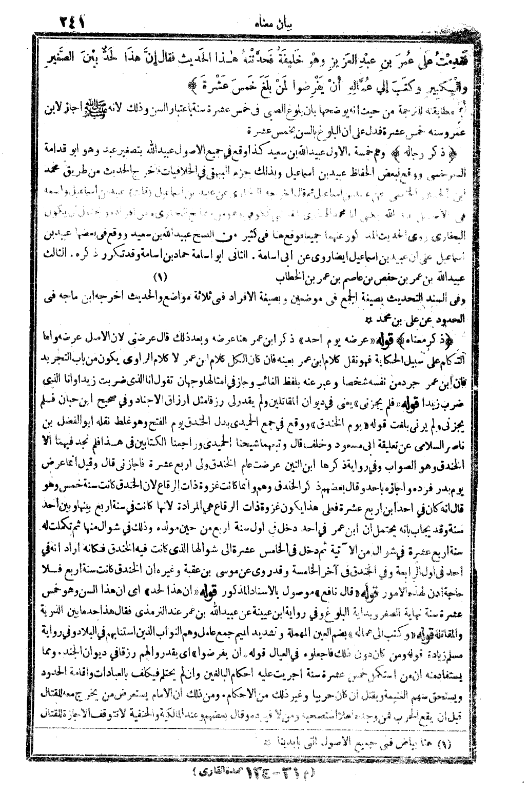 فقَدِمْتُ عَلى عُمَرَ بنِ عَبْدِ العَزِيزِ وهْو خَليفَةُ فَحدَّثْتُهُ هاذَا الحَدِيث فَقَالَ إنَّ هذَا لَحَدٌّ بَيْنَ الصَّغِيرِ والْكَبِيرِ وكَتَبَ إِلَى عُمَّالِهِ أنْ يَفْرِضُوا لِمَنْ بَلغَ خَمسَ عَشْرَةَ.
