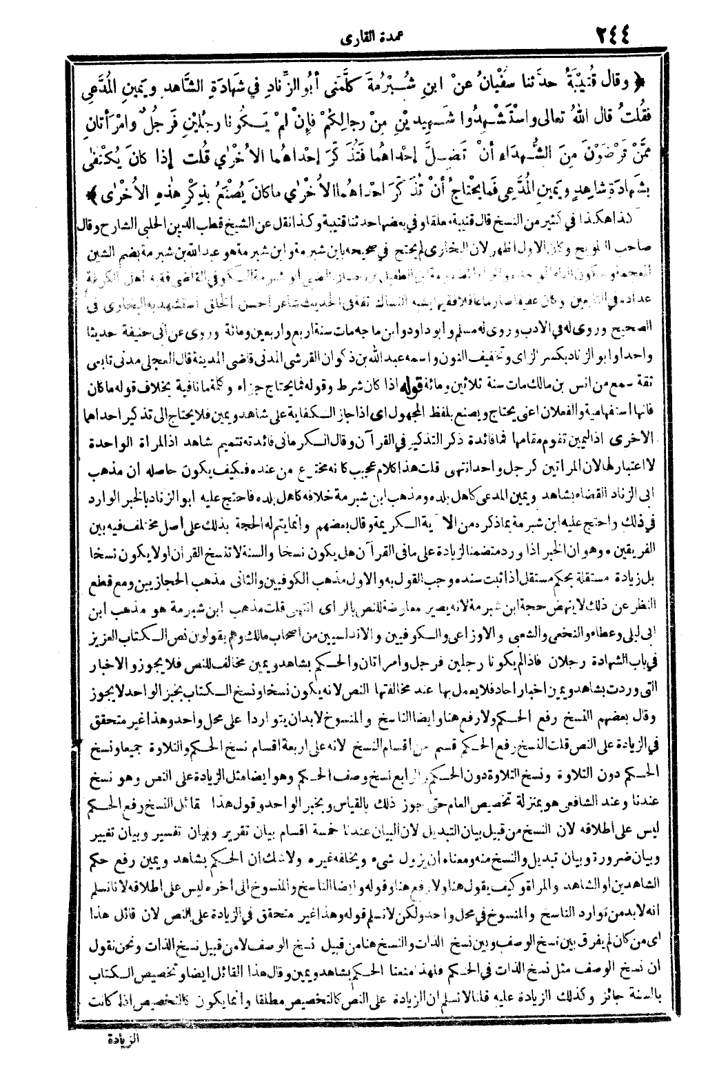 وَقَالَ قُتَيْبَةُ حدَّثنا سُفْيَانُ عنْ ابنِ شُبْرُمَةَ كلَّمَنِي أبُو الزِّنَادِ فِي شَهَادَةِ الشَّاهِدِ ويَمِينِ المُدَّعِي فقُلْتُ قَالَ الله تَعَالَى: {واسْتَشْهِدُوا شَهِيدَيْنِ مِنْ رِجَالِكُمْ فإنْ لَمْ يَكُونَا رجُلَيْنِ فَرَجُلٌ وامْرَأتَانِ مِمَّنْ تَرْضَوْنَ مِنَ الشُّهَدَاءِ أنْ تَضِلَّ إحْدَاهُمَا الأُخْراى} (الْبَقَرَة: 282) . قُلْتُ إذَا كانَ يُكْتَفى بِشَهَادَةِ شاهِدٍ ويَمِينِ المُدَّعِي فَمَا يَحْتاجُ أنْ تُذْكَرَ إحْدَاهُمَا الأخْراى مَا كانَ يُصْنَعُ بِذِكْرِ هاذِهِ الأُخْراى