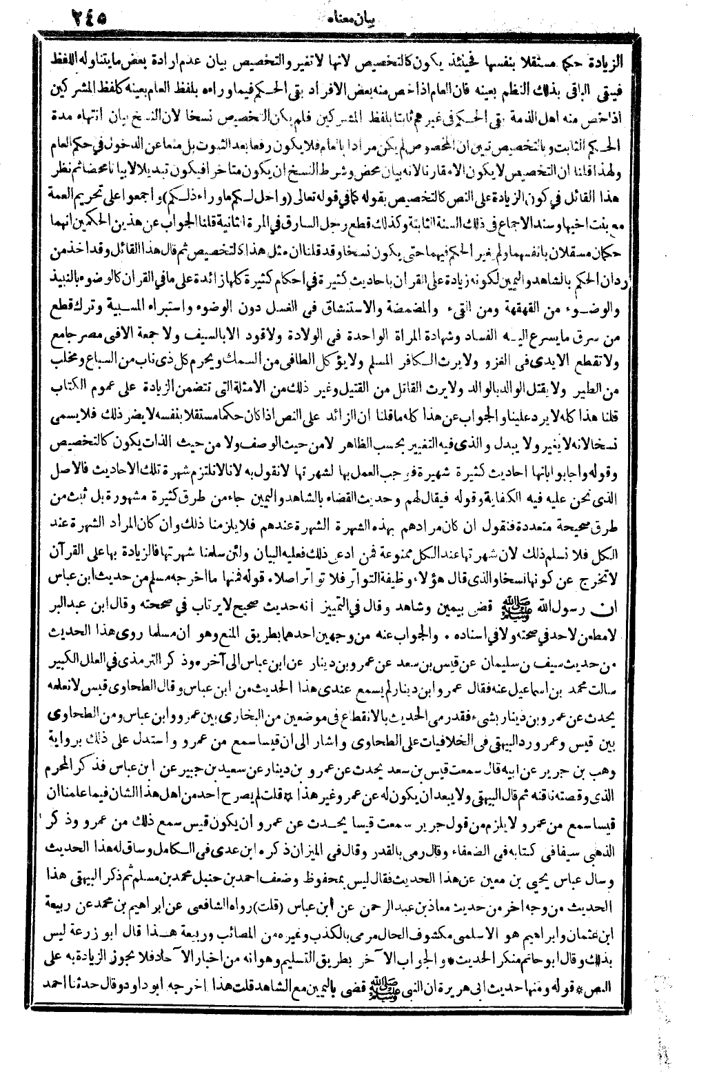 الزِّيَادَة حكما مُسْتقِلّا بِنَفسِهَا، فَحِينَئِذٍ يكون كالتخصيص، لِأَنَّهَا لَا تغير. والتخصيص بَيَان عدم إِرَادَة بعض مَا يتَنَاوَلهُ اللَّفْظ، فَيبقى الْبَاقِي بذلك النّظم بِعَيْنِه، فَإِن الْعَام إِذا خص مِنْهُ بعض الْأَفْرَاد بَقِي الحكم فِيمَا وَرَاءه بِلَفْظ الْعَام بِعَيْنِه، كَلَفْظِ الْمُشْركين إِذا خص مِنْهُ أهل الذِّمَّة بَقِي الحكم فِي غَيرهم ثَابتا بِلَفْظ الْمُشْركين، فَلم يكن التَّخْصِيص نسخا، لِأَن النّسخ بَيَان انْتِهَاء مُدَّة الحكم الثَّابِت، وبالتخصيص تبين أَن الْمَخْصُوص لم يكن مرَادا بِالْعَام فَلَا يكون رفعا بعد الثُّبُوت، بل منعا عَن الدُّخُول فِي حكم الْعَام، وَلِهَذَا قُلْنَا: إِن التَّخْصِيص لَا يكون إلاَّ مُقَارنًا، لِأَنَّهُ بَيَان مَحْض، وَشرط النّسخ أَن يكون مُتَأَخِّرًا، فَيكون تبديلاً لَا بَيَانا مَحْضا، ثمَّ نظر هَذَا الْقَائِل فِي كَون الزِّيَادَة على النَّص كالتخصيص. بقوله: كَمَا فِي قَوْله تَعَالَى: {وَأحل لكم مَا وَرَاء ذَلِكُم} (النِّسَاء: 42) . وَأَجْمعُوا على تَحْرِيم الْعمة مَعَ بنت أَخِيهَا، وَسَنَد الْإِجْمَاع فِي ذَلِك السّنة الثَّابِتَة، وَكَذَلِكَ قطع رجل السَّارِق فِي الْمرة الثَّانِيَة، قُلْنَا: الْجَواب عَن هذَيْن الْحكمَيْنِ أَنَّهُمَا حكمان مستقلان بأنفسهما، وَلم يغيرا لحكم فيهمَا حَتَّى يكون نسخا. وَقد قُلْنَا: إِن مثل هَذَا كالتخصيص ثمَّ قَالَ هَذَا الْقَائِل: وَقد أَخذ من رد أَن الحكم بِالشَّاهِدِ وَالْيَمِين لكَونه زِيَادَة على الْقُرْآن بِأَحَادِيث كَثِيرَة كلهَا زَائِدَة على مَا فِي الْقُرْآن: كَالْوضُوءِ بالنبيذ، وَالْوُضُوء من القهقهة، وَمن الْقَيْء، والمضمضة وَالِاسْتِنْشَاق فِي الْغسْل دون الْوضُوء، واستبراء المسبية، وَترك قطع من سرق مَا يسْرع إِلَيْهِ الْفساد، وَشَهَادَة الْمَرْأَة الْوَاحِدَة فِي الْولادَة، وَلَا قَود إلاَّ بِالسَّيْفِ، وَلَا جُمُعَة إلاَّ فِي مصر جَامع، وَلَا تقطع الْأَيْدِي فِي الْغَزْو، وَلَا يَرث الْكَافِر الْمُسلم، وَلَا يُؤْكَل الطافي من السّمك، وَيحرم كل ذِي نَاب من السبَاع ومخلب من الطير، وَلَا يقل الْوَالِد بالوالد، وَلَا يَرث الْقَاتِل من الْقَتِيل، وَغير ذَلِك من الْأَمْثِلَة الَّتِي تَتَضَمَّن الزِّيَادَة على عُمُوم الْكتاب، قُلْنَا: هَذَا كُله لَا يرد علينا، وَالْجَوَاب عَن هَذَا كُله مَا قُلْنَا: إِن الزَّائِد على النَّص إِذا كَانَ حكما مُسْتقِلّا بِنَفسِهِ لَا يضر ذَلِك، فَلَا يُسمى نسخا، لِأَنَّهُ لَا يُغير وَلَا يُبدل، وَالَّذِي فِيهِ التَّغْيِير بِحَسب الظَّاهِر لَا من حَيْثُ الْوَصْف وَلَا من حَيْثُ الذَّات يكون كالتخصيص.