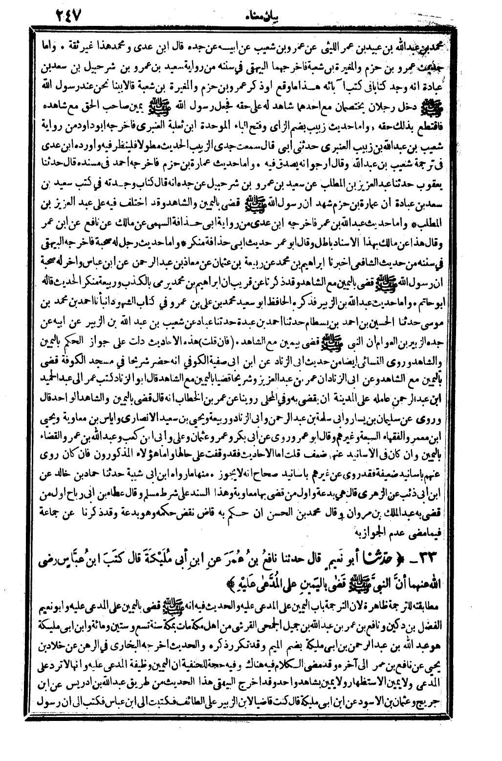 مُحَمَّد بن عبد الله بن عبيد بن عمر اللَّيْثِيّ عَن عَمْرو بن شُعَيْب عَن أَبِيه عَن جده، قَالَ ابْن عدي: وَمُحَمّد هَذَا غير ثِقَة. وَأما حَدِيث عَمْرو بن حزم والمغيرة بن شُعْبَة فأخرجهما الْبَيْهَقِيّ فِي (سنَنه) من رِوَايَة سعيد بن عَمْرو بن شُرَحْبِيل بن سعد بن عبَادَة أَنه وجد كتابا فِي كتب آبَائِهِ، هَذَا مَا وَقع، أَو ذكر عَمْرو بن حزم والمغيرة بن شُعْبَة، قَالَا: بَينا نَحن عِنْد رَسُول الله، صلى الله عَلَيْهِ وَسلم دخل رجلَانِ يختصمان، مَعَ أَحدهمَا شَاهد لَهُ على حَقه، فَجعل رَسُول الله، صلى الله عَلَيْهِ وَسلم يَمِين صَاحب الْحق مَعَ شَاهده فاقتطع بذلك حَقه. وَأما حَدِيث زبيب، بِضَم الزَّاي وَفتح الْبَاء الْمُوَحدَة: ابْن ثَعْلَبَة الْعَنْبَري فَأخْرجهُ أَبُو دَاوُد من رِوَايَة شُعَيْب بن عبد الله بن زبيب الْعَنْبَري: حَدثنِي أبي قَالَ: سَمِعت جدي الزَّبِيب ... الحَدِيث مطولا، فَلْينْظر فِيهِ وَأوردهُ ابْن عدي فِي تَرْجَمَة شُعَيْب بن عبد الله، وَقَالَ: أَرْجُو أَنه يصدق فِيهِ. وَأما حَدِيث عمَارَة بن حزم فَأخْرجهُ أَحْمد فِي (مُسْنده) قَالَ: حَدثنَا يَعْقُوب حَدثنَا عبد الْعَزِيز بن الْمطلب عَن سعيد بن عَمْرو بن شُرَحْبِيل عَن جده أَنه قَالَ: كتاب وجدته فِي كتب سعيد بن سعد بن عبَادَة: أَن عمَارَة بن حزم شهد أَن رَسُول الله، صلى الله عَلَيْهِ وَسلم قضى بِالْيَمِينِ وَالشَّاهِد، وَقد اخْتلف فِيهِ على عبد الْعَزِيز بن الْمطلب. وَأما حَدِيث عبد الله بن عمر فَأخْرجهُ ابْن عدي من رِوَايَة أبي حذافة السَّهْمِي عَن مَالك عَن نَافِع عَن ابْن عمر، وَقَالَ: هَذَا عَن مَالك بِهَذَا الْإِسْنَاد بَاطِل، وَقَالَ أَبُو عمر: حَدِيث أبي حذافة مُنكر. وَأما حَدِيث رجل لَهُ صُحْبَة فَأخْرجهُ الْبَيْهَقِيّ فِي (سنَنه) من حَدِيث الشَّافِعِي: أخبرنَا إِبْرَاهِيم بن مُحَمَّد عَن ربيعَة بن عُثْمَان عَن معَاذ بن عبد الرَّحْمَن عَن ابْن عَبَّاس، وَآخر لَهُ صُحْبَة: أَن رَسُول الله، صلى الله عَلَيْهِ وَسلم قضى بِالْيَمِينِ مَعَ الشَّاهِد، وَقد ذكرنَا عَن قريب أَن إِبْرَاهِيم بن مُحَمَّد يرمَى بِالْكَذِبِ، وَرَبِيعَة مُنكر الحَدِيث، قَالَه أَبُو حَاتِم. وَأما حَدِيث عبد الله بن الزبير فَذكره الْحَافِظ أَبُو سعيد مُحَمَّد بن عَليّ بن عَمْرو فِي كتاب (الشُّهُود) أَنبأَنَا أَحْمد بن مُحَمَّد بن مُوسَى حَدثنَا الْحُسَيْن بن أَحْمد بن بسطَام حَدثنَا أَحْمد بن عَبدة حَدثنَا عباد عَن شُعَيْب بن عبد الله بن الزبير عَن أَبِيه عَن جده الزبير بن الْعَوام: أَن النَّبِي، صلى الله عَلَيْهِ وَسلم قضى بِيَمِين مَعَ الشَّاهِد.