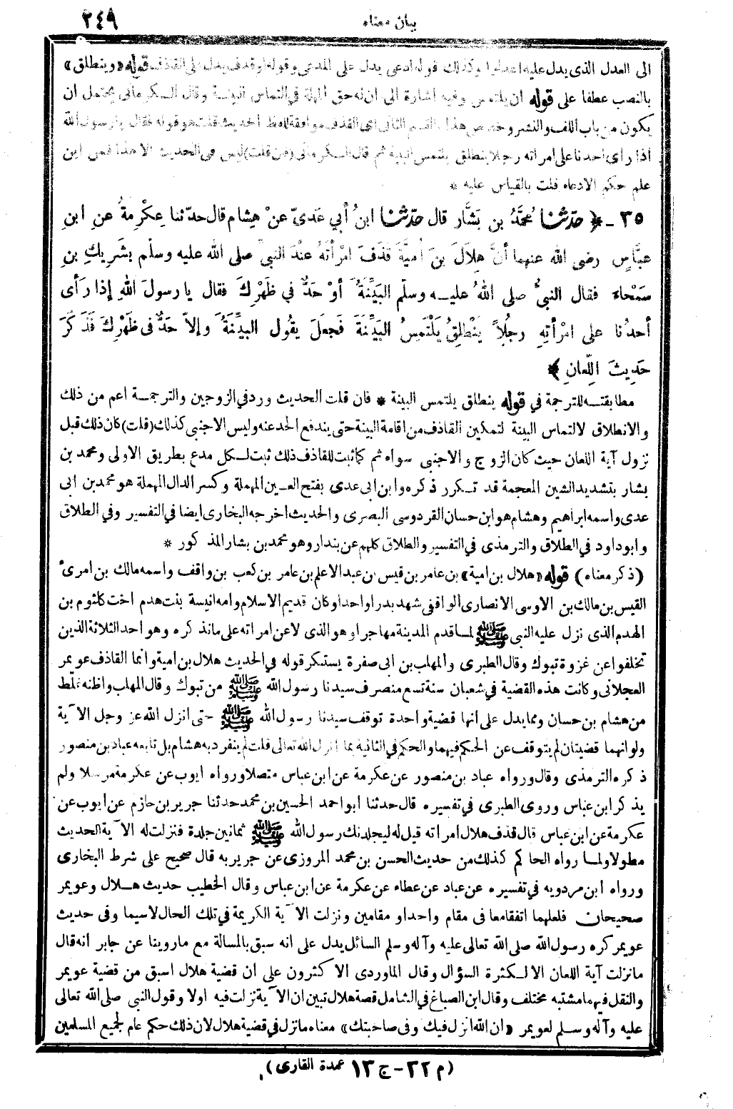 35 - (حَدثنَا مُحَمَّد بن بشار قَالَ حَدثنَا ابْن أبي عدي عَن هِشَام قَالَ حَدثنَا عِكْرِمَة عَن ابْن عَبَّاس رَضِي الله عَنْهُمَا أَن هِلَال بن أُميَّة قذف امْرَأَته عِنْد النَّبِي - صَلَّى اللَّهُ عَلَيْهِ وَسَلَّم َ - بِشريك بن سمحاء فَقَالَ النَّبِي - صَلَّى اللَّهُ عَلَيْهِ وَسَلَّم َ - الْبَيِّنَة أَو حد فِي ظهرك فَقَالَ يَا رَسُول الله إِذا رأى أَحَدنَا على امْرَأَته رجلا ينْطَلق يلْتَمس الْبَيِّنَة فَجعل يَقُول الْبَيِّنَة وَإِلَّا حد فِي ظهرك فَذكر حَدِيث اللّعان) مطابقته للتَّرْجَمَة فِي قَوْله ينْطَلق يلْتَمس الْبَيِّنَة فَإِن قلت الحَدِيث ورد فِي الزَّوْجَيْنِ والترجمة أَعم من ذَلِك والانطلاق لالتماس الْبَيِّنَة لتمكين الْقَاذِف من إِقَامَة الْبَيِّنَة حَتَّى ينْدَفع الْحَد عَنهُ وَلَيْسَ الْأَجْنَبِيّ كَذَلِك (قلت) كَانَ ذَلِك قبل نزُول آيَة اللّعان حَيْثُ كَانَ الزَّوْج وَالْأَجْنَبِيّ سَوَاء ثمَّ كَمَا ثَبت للقاذف ذَلِك ثَبت لكل مُدع بطرِيق الأولى وَمُحَمّد بن بشار بتَشْديد الشين الْمُعْجَمَة قد تكَرر ذكره وَابْن أبي عدي بِفَتْح الْعين الْمُهْملَة وَكسر الدَّال الْمُهْملَة هُوَ مُحَمَّد بن أبي عدي واسْمه إِبْرَاهِيم وَهِشَام هُوَ ابْن حسان القردوسي الْبَصْرِيّ والْحَدِيث أخرجه البُخَارِيّ أَيْضا فِي التَّفْسِير وَفِي الطَّلَاق وَأَبُو دَاوُد فِي الطَّلَاق وَالتِّرْمِذِيّ فِي التَّفْسِير وَالطَّلَاق كلهم عَن بنْدَار وَهُوَ مُحَمَّد بن بشار الْمَذْكُور (ذكر مَعْنَاهُ) قَوْله " هِلَال بن أُميَّة " بن عَامر بن قيس بن عبد الأعلم بن عَامر بن كَعْب بن وَاقِف واسْمه مَالك بن امرىء الْقَيْس بن مَالك بن الأوسي الْأنْصَارِيّ الوَاقِفِي شهد بَدْرًا وأحدا وَكَانَ قديم الْإِسْلَام وَأمه أنيسَة بنت هدم أُخْت كُلْثُوم بن الْهدم الَّذِي نزل عَلَيْهِ النَّبِي - صَلَّى اللَّهُ عَلَيْهِ وَسَلَّم َ - لما قدم الْمَدِينَة مُهَاجرا وَهُوَ الَّذِي لَاعن امْرَأَته على مَا نذكرهُ وَهُوَ أحد الثَّلَاثَة الَّذين تخلفوا عَن غَزْوَة تَبُوك وَقَالَ الطَّبَرِيّ والمهلب بن أبي صفرَة يستنكر قَوْله فِي الحَدِيث هِلَال بن أُميَّة وَإِنَّمَا الْقَاذِف عُوَيْمِر الْعجْلَاني وَكَانَت هَذِه الْقَضِيَّة فِي شعْبَان سنة تسع منصرف سيدنَا رَسُول الله - صَلَّى اللَّهُ عَلَيْهِ وَسَلَّم َ - من تَبُوك وَقَالَ الْمُهلب وَأَظنهُ غلط من هِشَام بن حسان وَمِمَّا يدل على أَنَّهَا قَضِيَّة وَاحِدَة توقف سيدنَا رَسُول الله - صَلَّى اللَّهُ عَلَيْهِ وَسَلَّم َ - حَتَّى أنزل الله عز وَجل الْآيَة وَلَو أَنَّهُمَا قضيتان لم يتَوَقَّف عَن الحكم فيهمَا وَالْحكم فِي الثَّانِيَة بِمَا أنزل الله تَعَالَى قلت لم ينْفَرد بِهِ هِشَام بل تَابعه عباد بن مَنْصُور ذكره التِّرْمِذِيّ وَقَالَ وَرَوَاهُ عباد بن مَنْصُور عَن عِكْرِمَة عَن ابْن عَبَّاس مُتَّصِلا وَرَوَاهُ أَيُّوب عَن عِكْرِمَة مُرْسلا وَلم يذكر ابْن عَبَّاس وروى الطَّبَرِيّ فِي تَفْسِيره قَالَ حَدثنَا أَبُو أَحْمد الْحُسَيْن بن مُحَمَّد حَدثنَا جرير بن حَازِم عَن أَيُّوب عَن عِكْرِمَة عَن ابْن عَبَّاس قَالَ قذف هِلَال امْرَأَته قيل لَهُ ليجلدنك رَسُول الله - صَلَّى اللَّهُ عَلَيْهِ وَسَلَّم َ - ثَمَانِينَ جلدَة فَنزلت لَهُ الْآيَة الحَدِيث مطولا وَلما رَوَاهُ الْحَاكِم كَذَلِك من حَدِيث الْحسن بن مُحَمَّد الْمروزِي عَن جرير بِهِ قَالَ صَحِيح على شَرط البُخَارِيّ وَرَوَاهُ ابْن مرْدَوَيْه فِي تَفْسِيره عَن عباد عَن عَطاء عَن عِكْرِمَة عَن ابْن عَبَّاس وَقَالَ الْخَطِيب حَدِيث هِلَال وعويمر صَحِيحَانِ فلعلهما اتفقَا مَعًا فِي مقَام وَاحِد أَو مقامين وَنزلت الْآيَة الْكَرِيمَة فِي تِلْكَ الْحَال لَا سِيمَا وَفِي حَدِيث عُوَيْمِر كره رَسُول الله - صَلَّى اللَّهُ عَلَيْهِ وَسَلَّم َ - السَّائِل يد