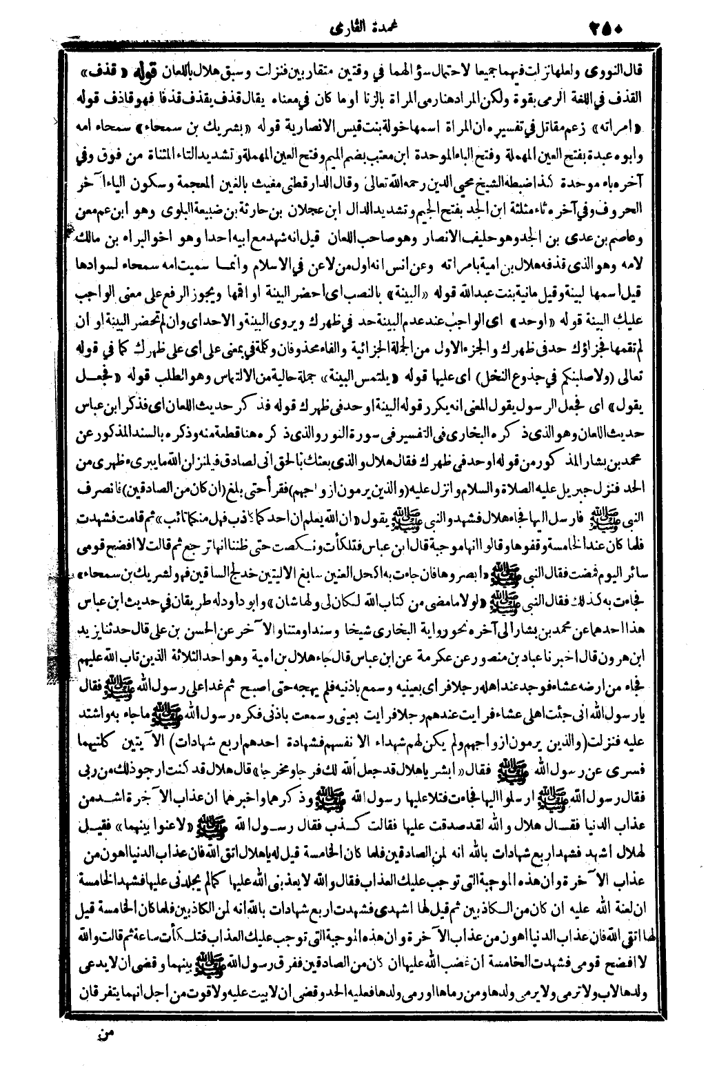 قَالَ النَّوَوِيّ ولعلها نزلت فيهمَا جَمِيعًا لاحْتِمَال سؤالهما فِي وَقْتَيْنِ متقاربين فَنزلت وَسبق هِلَال بِاللّعانِ قَوْله " قذف " الْقَذْف فِي اللُّغَة الرَّمْي بِقُوَّة وَلَكِن المُرَاد هُنَا رمي الْمَرْأَة بِالزِّنَا أَو مَا كَانَ فِي مَعْنَاهُ يُقَال قذف يقذف قذفا فَهُوَ قَاذف قَوْله " امْرَأَته " زعم مقَاتل فِي تَفْسِيره أَن الْمَرْأَة اسْمهَا خَوْلَة بنت قيس الْأَنْصَارِيَّة قَوْله " بِشريك بن سمحاء " سمحاء أمه وَأَبُو عَبدة بِفَتْح الْعين الْمُهْملَة وَفتح الْبَاء الْمُوَحدَة ابْن معتب بِضَم الْمِيم وَفتح الْعين الْمُهْملَة وَتَشْديد التَّاء الْمُثَنَّاة من فَوق وَفِي آخِره بَاء مُوَحدَة كَذَا ضَبطه الشَّيْخ مُحي الدّين رَحمَه الله تَعَالَى وَقَالَ الدَّارَقُطْنِيّ مغيث بالغين الْمُعْجَمَة وَسُكُون الْيَاء آخر الْحُرُوف وَفِي آخِره ثاء مُثَلّثَة ابْن الْجد بِفَتْح الْجِيم وَتَشْديد الدَّال ابْن عجلَان بن حَارِثَة بن ضبيعة البلوي وَهُوَ ابْن عَم معن وَعَاصِم بن عدي بن الْجد وَهُوَ حَلِيف الْأَنْصَار وَهُوَ صَاحب اللّعان قيل أَنه شهد مَعَ أَبِيه أحدا وَهُوَ أَخُو الْبَراء بن مَالك لأمه وَهُوَ الَّذِي قذفه هِلَال بن أُميَّة بامرأته وَعَن أنس أَنه أول من لَاعن فِي الْإِسْلَام وَإِنَّمَا سميت أمه سمحاء لسوادها قيل اسْمهَا لبينة وَقيل مانية بنت عبد الله قَوْله " الْبَيِّنَة " بِالنّصب أَي أحضر الْبَيِّنَة أَو أقمها وَيجوز الرّفْع على معنى الْوَاجِب عَلَيْك الْبَيِّنَة قَوْله " أَو حد " أَي الْوَاجِب عِنْد عدم الْبَيِّنَة حد فِي ظهرك ويروي الْبَيِّنَة وَإِلَّا حد أَي وَإِن لم تحضر الْبَيِّنَة أَو إِن لم تقمها فجزاؤك حد فِي ظهرك والجزء الأول من الْجُمْلَة الجزائية وَالْفَاء محذوفان وَكلمَة فِي بِمَعْنى على أَي على ظهرك كَمَا فِي قَوْله تَعَالَى {ولأصلبنكم فِي جُذُوع النّخل} أَي عَلَيْهَا قَوْله " يلْتَمس الْبَيِّنَة " جملَة حَالية من الالتماس وَهُوَ الطّلب قَوْله " فَجعل يَقُول " أَي فَجعل الرَّسُول يَقُول الْمَعْنى أَنه يُكَرر قَوْله الْبَيِّنَة أَو حد فِي ظهرك قَوْله فَذكر حَدِيث اللّعان أَي فَذكر ابْن عَبَّاس حَدِيث اللّعان وَهُوَ الَّذِي ذكره البُخَارِيّ فِي التَّفْسِير فِي سُورَة النُّور وَالَّذِي ذكره هُنَا قِطْعَة مِنْهُ وَذكره بالسند الْمَذْكُور عَن مُحَمَّد بن بشار الْمَذْكُور من قَوْله أَو حد فِي ظهرك فَقَالَ هِلَال وَالَّذِي بَعثك بِالْحَقِّ إِنِّي لصَادِق فلينزلن الله مَا يبرىء ظَهْري من الْحَد فَنزل جِبْرِيل عَلَيْهِ الصَّلَاة وَالسَّلَام وَأنزل عَلَيْهِ {وَالَّذين يرْمونَ أَزوَاجهم} فَقَرَأَ حَتَّى بلغ {إِن كَانَ من الصَّادِقين} فَانْصَرف النَّبِي - صَلَّى اللَّهُ عَلَيْهِ وَسَلَّم َ - فَأرْسل إِلَيْهَا فجَاء هِلَال فَشهد وَالنَّبِيّ - صَلَّى اللَّهُ عَلَيْهِ وَسَلَّم َ - يَقُول " إِن الله يعلم أَن أَحَدكُمَا كَاذِب فَهَل مِنْكُمَا تائب " ثمَّ قَامَت فَشَهِدت فَلَمَّا كَانَ عِنْد الْخَامِسَة وقفوها وَقَالُوا إِنَّهَا مُوجبَة قَالَ ابْن عَبَّاس فتلكأت وَنَكَصت حَتَّى ظننا أَنَّهَا ترجع ثمَّ قَالَت لَا أفضح قومِي سَائِر الْيَوْم فمضت فَقَالَ النَّبِي - صَلَّى اللَّهُ عَلَيْهِ وَسَلَّم َ - " أبصروها فَإِن جَاءَت بِهِ أكحل الْعَينَيْنِ سابغ الأليتين خَدلج السَّاقَيْن فَهُوَ لِشَرِيك بن سمحاء " فَجَاءَت بِهِ كَذَلِك فَقَالَ النَّبِي - صَلَّى اللَّهُ عَلَيْهِ وَسَلَّم َ - " لَوْلَا مَا مضى من كتاب الله لَكَانَ لي وَلها شَأْن " وَأَبُو دَاوُد لَهُ طَرِيقَانِ فِي حَدِيث ابْن عَبَّاس هَذَا أَحدهمَا عَن مُحَمَّد بن بشار إِلَى آخِره نَحْو رِوَايَة البُخَارِيّ شَيخا وسندا ومتنا وَالْآخر عَن الْحسن بن عَليّ قَالَ حَدثنَا يزِيد بن هرون قَالَ أخبرنَا عباد بن مَنْصُور عَن عِكْرِمَة عَن ابْن عَبَّاس قَالَ جَ