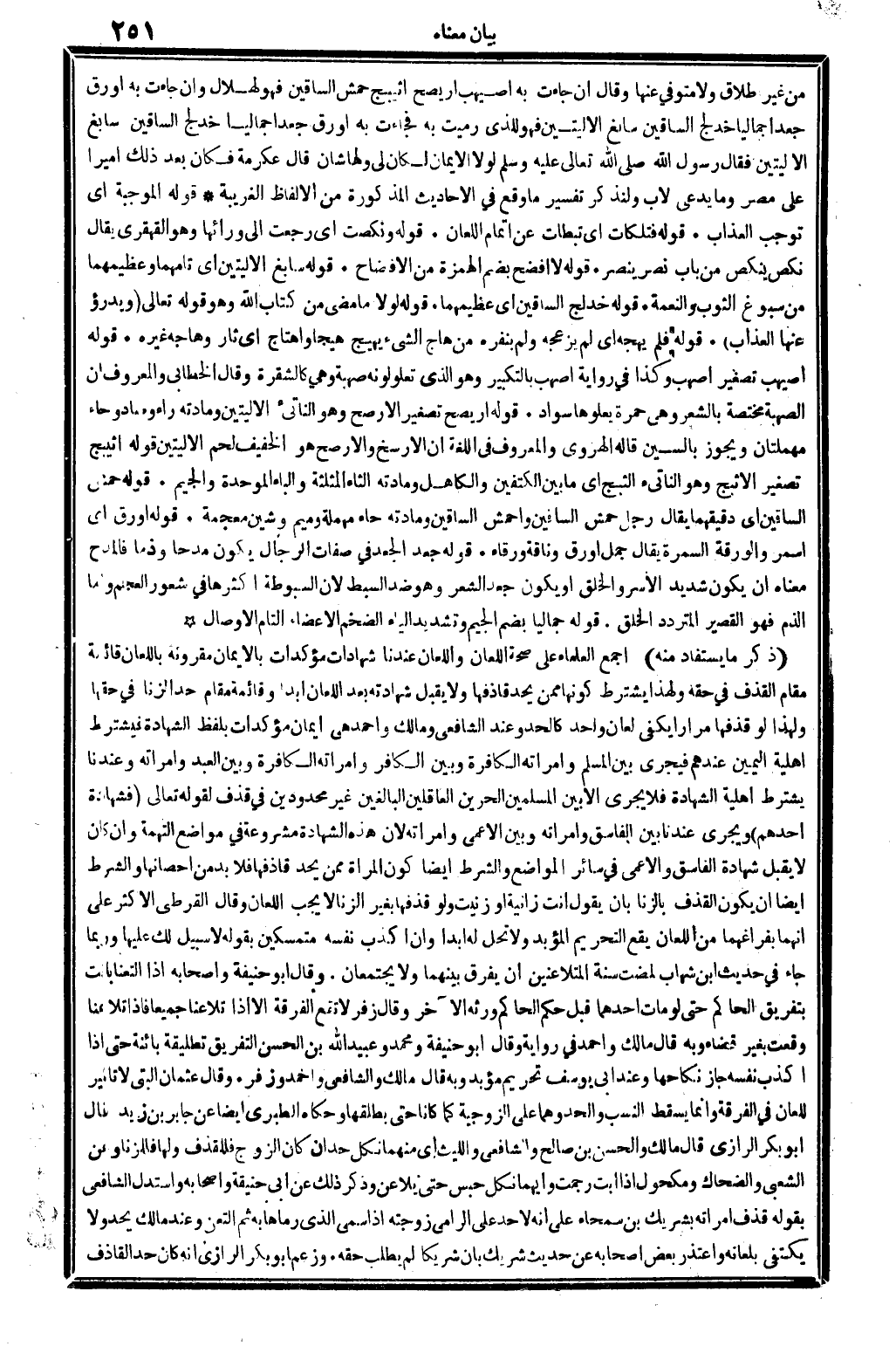 من غير طَلَاق وَلَا متوفي عَنْهَا وَقَالَ إِن جَاءَت بِهِ أُصَيْهِب أريصح أثيبج حمش السَّاقَيْن فَهُوَ لهِلَال وَإِن جَاءَت بِهِ أَوْرَق جَعدًا جمالِيًّا خَدلج السَّاقَيْن سابغ الأليتين فَهُوَ للَّذي رميت بِهِ فَجَاءَت بِهِ أَوْرَق جَعدًا جمالِيًّا خَدلج السَّاقَيْن سَابق الأليتين فَقَالَ رَسُول الله - صَلَّى اللَّهُ عَلَيْهِ وَسَلَّم َ - لَوْلَا الْأَيْمَان لَكَانَ لي وَلها شَأْن قَالَ عِكْرِمَة فَكَانَ بعد ذَلِك أَمِيرا على مصر وَمَا يدعى لأَب ولنذكر تَفْسِير مَا وَقع فِي الْأَحَادِيث الْمَذْكُورَة من الْأَلْفَاظ الغريبة قَوْله الْمُوجبَة أَي توجب الْعَذَاب. قَوْله فتلكأت أَي تبطأت عَن إتْمَام اللّعان. قَوْله وَنَكَصت أَي رجعت إِلَى وَرَائِهَا وَهُوَ الْقَهْقَرَى يُقَال نكص يَنْكص من بَاب نصر ينصر. قَوْله لَا أفضح بِضَم الْهمزَة من الإفضاح. قَوْله سابغ الأليتين أَي تامهما وعظيمهما من سبوغ الثَّوْب وَالنعْمَة. قَوْله خَدلج السَّاقَيْن أَي عظيمهما. قَوْله لَوْلَا مَا مضى من كتاب الله وَهُوَ قَوْله تَعَالَى {ويدرؤ عَنْهَا الْعَذَاب} . قَوْله فَلم يهجه أَي لم يزعجه وَلم ينفره من هاج الشَّيْء يهيج هيجا واهتاج أَي ثار وهاجه غَيره. قَوْله أُصَيْهِب تَصْغِير أصهب وَكَذَا فِي رِوَايَة أصهب بِالتَّكْبِيرِ وَهُوَ الَّذِي تعلو لَونه صهبة وَهِي كالشقرة وَقَالَ الْخطابِيّ وَالْمَعْرُوف أَن الصهبة مُخْتَصَّة بالشعر وَهِي حمرَة يعلوها سَواد. قَوْله أريصح تَصْغِير الأرصح وَهُوَ الناتىء الأليتين ومادته رَاء وصاد وحاء مهملتان وَيجوز بِالسِّين قَالَه الْهَرَوِيّ وَالْمَعْرُوف فِي اللُّغَة أَن الأرسخ والأرصح هُوَ الْخَفِيف لحم الأليتين قَوْله أثيبج تَصْغِير الأثبج وَهُوَ الناتىء الثبج أَي مَا بَين الْكَتِفَيْنِ والكاهل ومادته الثَّاء الْمُثَلَّثَة وَالْبَاء الْمُوَحدَة وَالْجِيم. قَوْله حمش السَّاقَيْن أَي دقيقهما يُقَال رجل حمش السَّاقَيْن وأحمش السَّاقَيْن ومادته حاء مُهْملَة وَمِيم وشين مُعْجمَة. قَوْله أَوْرَق أَي أسمر والورقة السمرَة يُقَال جمل أَوْرَق وناقة وَرْقَاء. قَوْله جعد الْجَعْد فِي صِفَات الرِّجَال يكون مدحا وذما فالمدح مَعْنَاهُ أَن يكون شَدِيد الْأسر والخلق أَو يكون جعد الشّعْر وَهُوَ ضد السبط لِأَن السبوطة أَكْثَرهَا فِي شُعُور الْعَجم وَأما الذَّم فَهُوَ الْقصير المتردد الْخلق. قَوْله جمالِيًّا بِضَم الْجِيم وَتَشْديد الْيَاء الضخم الْأَعْضَاء التَّام الأوصال (ذكر مَا يُسْتَفَاد مِنْهُ) أجمع الْعلمَاء على صِحَة اللّعان وَاللّعان عندنَا شَهَادَات مؤكدات بالأيمان مقرونة بِاللّعانِ قَائِمَة مقَام الْقَذْف فِي حَقه وَلِهَذَا يشْتَرط كَونهَا مِمَّن يحد قاذفها وَلَا يقبل شَهَادَته بعد اللّعان أبدا وقائمة مقَام حد الزِّنَا فِي حَقّهَا وَلِهَذَا لَو قَذفهَا مرَارًا يَكْفِي لعان وَاحِد كالحد وَعند الشَّافِعِي وَمَالك وَأحمد هِيَ أَيْمَان مؤكدات بِلَفْظ الشَّهَادَة فَيشْتَرط أَهْلِيَّة الْيَمين عِنْدهم فَيجْرِي بَين الْمُسلم وَامْرَأَته الْكَافِرَة وَبَين الْكَافِر وَامْرَأَته الْكَافِرَة وَبَين العَبْد وَامْرَأَته وَعِنْدنَا يشْتَرط أَهْلِيَّة الشَّهَادَة فَلَا يجْرِي إِلَّا بَين الْمُسلمين الحرين العاقلين الْبَالِغين غير محدودين فِي قذف لقَوْله تَعَالَى {فشهادة أحدهم} وَيجْرِي عندنَا بَين الْفَاسِق وَامْرَأَته وَبَين الْأَعْمَى وَامْرَأَته لِأَن هَذِه الشَّهَادَة مَشْرُوعَة فِي مَوَاضِع التُّهْمَة وَإِن كَانَ لَا يقبل شَهَادَة الْفَاسِق وَالْأَعْمَى فِي سَائِر الْمَوَاضِع وَالشّرط أَيْضا كَون الْمَرْأَة مِمَّن يحد قاذفها فَلَا بُد من إحصانها وَالشّرط أَيْضا أَن يكون الْقَذْف بِالزِّنَا بِأَن يَقُول أَنْت زَانِيَة أَو زَنَيْت وَلَو قَذفهَا بِغَيْر الزِّنَا لَا يجب اللّعان وَقَالَ الْقُ