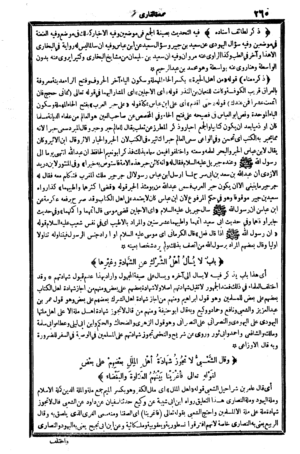 أَي: هَذَا بَاب يذكر فِيهِ: لَا يُسْألُ ... إِلَى آخِره، وَيسْأل على صِيغَة الْمَجْهُول، وَأَرَادَ بِهَذَا عدم قبُول شَهَادَتهم. وَقد اخْتلف الْعلمَاء فِي ذَلِك: فَعِنْدَ الْجُمْهُور: لَا تقبل شَهَادَتهم أصلا وَلَا شَهَادَة بَعضهم على بعض، وَمِنْهُم من أَجَارَ شَهَادَة أهل الْكتاب بَعضهم على بعض للْمُسلمين، وَهُوَ قَول إِبْرَاهِيم، وَمِنْهُم من أجَاز شَهَادَة أهل الشّرك بَعضهم على بعض، وَهُوَ قَول عمر بن عبد الْعَزِيز وَالشعْبِيّ وَنَافِع وَحَمَّاد ووكيع، وَبِه قَالَ أَبُو حنيفَة، وَمِنْهُم من قَالَ: لَا تجوز شَهَادَة أهل مِلَّة إلاَّ على أهل ملتها الْيَهُودِيّ على الْيَهُودِيّ وَالنَّصْرَانِيّ على النَّصْرَانِي وَهُوَ قَول الزُّهْرِيّ وَالضَّحَّاك وَالْحكم وَابْن أبي ليلى وَعَطَاء وَأبي سَلمَة وَمَالك وَالشَّافِعِيّ وَأحمد وَأبي ثَوْر وروى عَن شُرَيْح وَالنَّخَعِيّ تجوز شَهَادَتهم على الْمُسلمين فِي الْوَصِيَّة فِي السّفر للضَّرُورَة وَبِه قَالَ الْأَوْزَاعِيّ.