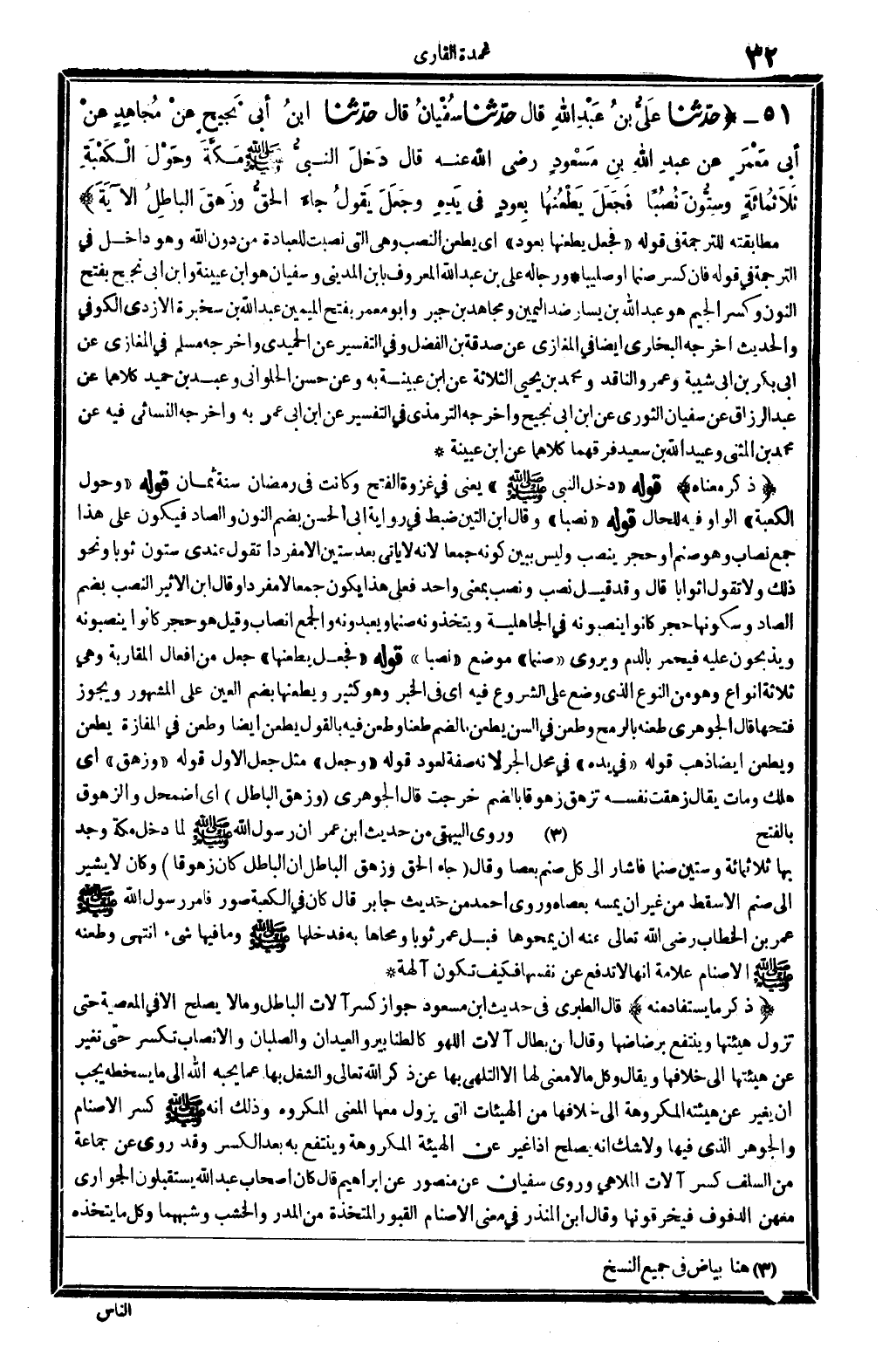8742 - حدَّثنا عَلِيُّ بنُ عَبْدُ الله قَالَ حدَّثنا سُفْيانُ قَالَ حدَّثنا ابنُ أبِي نَجِيحٍ عنْ مُجَاهِدٍ عنْ أبِي مَعْمَرٍ عنْ عَبْدِ الله بنِ مَسْعُودٍ رَضِي الله تَعَالَى عنهُ قَالَ دَخلَ النبيُّ صلى الله عَلَيْهِ وَسلم مَكَّةَ وحَوْلَ الْكَعْبَةِ ثَلاَثُمائَةٍ وسِتُّونَ نُصُباً فجَعَلَ يَطْعُنُهَا بِعودٍ فِي يَدِهِ وجَعلَ يَقولُ {جاءَ الْحَقُّ وزَهَقَ الْبَاطِلُ} الْآيَة (الْإِسْرَاء: 18) .
