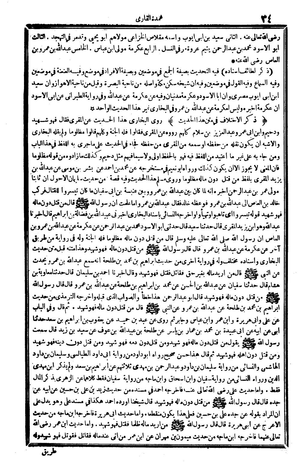 ثمَّ قَالَ: وَفِي الْبَاب عَن عَليّ وَأبي هُرَيْرَة وَابْن عمر وَابْن عَبَّاس وَجَابِر، ثمَّ روى عَن عبد بن حميد عَن يَعْقُوب بن إِبْرَاهِيم بن سعد حَدثنَا أبي عَن أَبِيه عَن أبي عُبَيْدَة بن مُحَمَّد بن عمار بن يَاسر عَن طَلْحَة بن عبيد الله بن عَوْف عَن سعيد بن زيد، قَالَ: سَمِعت رَسُول الله صلى الله عَلَيْهِ وَسلم يَقُول: من قتل دون مَاله فَهُوَ شَهِيد، وَمن قتل دون دَمه فَهُوَ شَهِيد، وَمن قتل دون دينه فَهُوَ شَهِيد. وَمن قتل دون أَهله فَهُوَ شَهِيد ثمَّ قَالَ: هَذَا حسن صَحِيح رَوَاهُ أَبُو دَاوُد من رِوَايَة أبي دَاوُد الطَّيَالِسِيّ وَسليمَان بن دَاوُد الْهَاشِمِي، وَالنَّسَائِيّ من رِوَايَة سُفْيَان وَابْن إِسْحَاق وإبن مَاجَه من رِوَايَة سُفْيَان فَقَط، كِلَاهُمَا عَن الزُّهْرِيّ بِذكر المَال فَقَط. وَأما حَدِيث عَليّ، رَضِي الله تَعَالَى عَنهُ، فَأخْرجهُ أَحْمد فِي (مُسْنده) من حَدِيث زيد بن عَليّ بن حُسَيْن عَن أَبِيه عَن جده، قَالَ: قَالَ رَسُول الله صلى الله عَلَيْهِ وَسلم: من قتل دون مَاله فَهُوَ شَهِيد. قَالَ شَيخنَا: أوردهُ أَحْمد هَكَذَا فِي مُسْند عَليّ، وَهُوَ يدل على أَن المُرَاد بقوله عَن جده، عَليّ بن حُسَيْن، فعلى هَذَا يكون مُنْقَطِعًا. وَأما حَدِيث أبي هُرَيْرَة فَأخْرجهُ ابْن مَاجَه من حَدِيث الْأَعْرَج عَن أبي هُرَيْرَة قَالَ: قَالَ رَسُول الله صلى الله عَلَيْهِ وَسلم: من أُرِيد مَاله ظلما فَقتل فَهُوَ شَهِيد. وَأما حَدِيث ابْن عمر، رَضِي الله تَعَالَى عَنْهُمَا، فَأخْرجهُ ابْن مَاجَه من حَدِيث مَيْمُون بن مهْرَان عَن ابْن عمر: من أُتِي عِنْد مَاله فقاتل فقوتل فَهُوَ شَهِيد، وَله