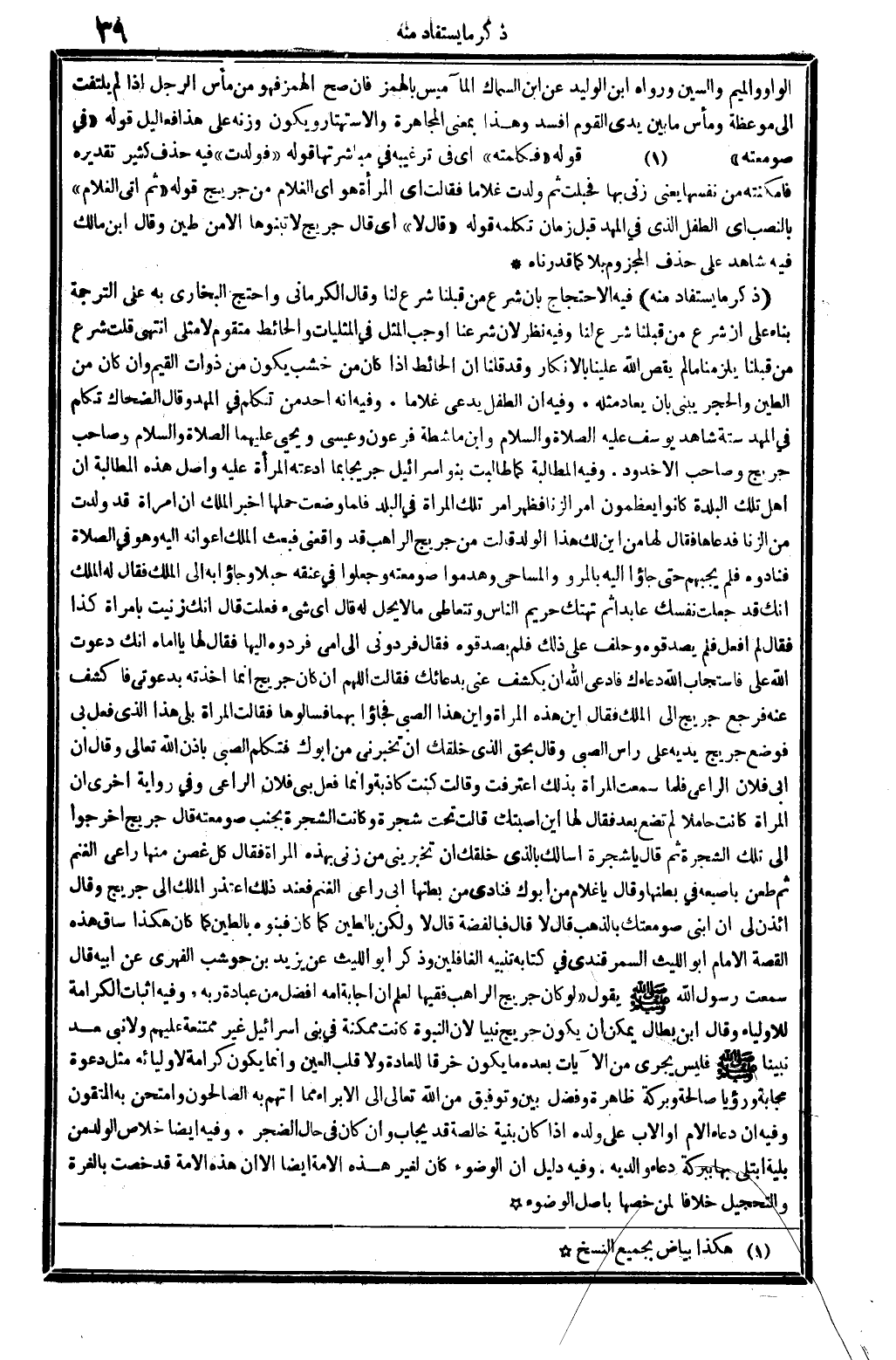 ذكر مَا يُسْتَفَاد مِنْهُ: فِيهِ: الِاحْتِجَاج بِأَن شرع من قبلنَا شرع لنا، وَقَالَ الْكرْمَانِي: وَاحْتج البُخَارِيّ بِهِ على التَّرْجَمَة بِنَاء على أَن شرع من قبلنَا شرع لنا، وَفِيه نظر، لِأَن شرعنا أوجب الْمثل فِي الْمِثْلِيَّات، والحائط مُتَقَوّم لَا مثلي. انْتهى. قلت: شرع من قبلنَا يلْزمنَا مَا لم يقص الله علينا بالإنكار، وَقد قُلْنَا: إِن الْحَائِط إِذا كَانَ من خشب يكون من ذَوَات الْقيم، وَإِن كَانَ من الطين وَالْحجر يبْنى بِأَن يُعَاد مثله. وَفِيه: أَن الطِّفْل يدعى غُلَاما وَفِيه: أَنه أحد من تكلم فِي المهد، وَقَالَ الضَّحَّاك: تكلم فِي المهد سِتَّة: شَاهد يُوسُف، عَلَيْهِ الصَّلَاة وَالسَّلَام، وَابْن ماشطة فِرْعَوْن، وَعِيسَى، وَيحيى، عَلَيْهِمَا الصَّلَاة وَالسَّلَام، وَصَاحب جريج، وَصَاحب الْأُخْدُود. وَفِيه: الْمُطَالبَة، كَمَا طالبت بَنو إِسْرَائِيل جريجاً بِمَا ادَّعَتْهُ الْمَرْأَة عَلَيْهِ، وأصل هَذِه الْمُطَالبَة أَن أهل تِلْكَ الْبَلدة كَانُوا يعظمون أَمر الزِّنَا، فَظهر أَمر تِلْكَ الْمَرْأَة فِي الْبَلَد، فَلَمَّا وضعت حملهَا أخبر الْملك أَن امْرَأَة قد ولدت من الزِّنَا، فَدَعَاهَا فَقَالَ لَهَا: من أَيْن لَك هَذَا الْوَلَد؟ قَالَت: من جريج الراهب، قد واقعني. فَبعث الْملك أعوانه إِلَيْهِ وَهُوَ فِي الصَّلَاة فَنَادَوْهُ فَلم يجبهم حَتَّى جاؤا إِلَيْهِ بالمرو والمساحي وهدموا صومعته وَجعلُوا فِي عُنُقه حبلاً وجاؤا بِهِ إِلَى الْملك، فَقَالَ لَهُ الْملك: إِنَّك قد جعلت نَفسك عابداً ثمَّ تهتك حَرِيم النَّاس وتتعاطى مَا لَا يحل لَهُ؟ قَالَ: أَي شَيْء فعلت؟ قَالَ: إِنَّك زَنَيْت بِامْرَأَة كَذَا. فَقَالَ: لم أفعل، فَلم يصدقوه وَحلف على ذَلِك فَلم يصدقوه، فَقَالَ: فردوني إِلَى أُمِّي، فَردُّوهُ إِلَيْهَا فَقَالَ لَهَا: يَا أُمَّاهُ إِنَّك دَعَوْت الله عَليّ فَاسْتَجَاب الله دعاءك، فَادّعى الله أَن يكْشف عني بدعائك. فَقَالَت: أللهم إِن كَانَ جريج إِنَّمَا أَخَذته بدعوتي فاكشف عَنهُ، فَرجع جريج إِلَى الْملك، فَقَالَ: أَيْن هَذِه الْمَرْأَة؟ وَأَيْنَ هَذَا الصَّبِي؟ فجاؤا بهما، فسألوهما، فَقَالَت الْمَرْأَة: بلَى هَذَا الَّذِي فعل بِي، فَوضع جريج يَدَيْهِ على رَأس الصَّبِي، وَقَالَ: بِحَق الَّذِي خلقك أَن تُخبرنِي من أَبوك؟ فَتكلم الصَّبِي بِإِذن الله تَعَالَى، وَقَالَ: إِن أبي فلَان الرَّاعِي، فَلَمَّا سَمِعت الْمَرْأَة بذلك اعْترفت، وَقَالَت: كنت كَاذِبَة، وَإِنَّمَا فعل بِي فلَان الرَّاعِي. وَفِي رِوَايَة أُخْرَى أَن الْمَرْأَة كَانَت حَامِلا لم تضع بعد، فَقَالَ لَهَا: أَيْن أصبتك؟ قَالَت: تَحت شَجَرَة، وَكَانَت الشَّجَرَة بِجنب صومعته، قَالَ جريج: أخرجُوا إِلَى تِلْكَ الشَّجَرَة، ثمَّ قَالَ: يَا شَجَرَة {أَسأَلك بِالَّذِي خلقكك أَن تخبريني من زنى بِهَذِهِ الْمَرْأَة؟ فَقَالَ كل غُصْن مِنْهَا: راعي الْغنم، ثمَّ طعن بإصبعه فِي بَطنهَا، وَقَالَ: يَا غُلَام} من أَبوك؟ فَنَادَى من بَطنهَا: أبي راعي الْغنم، فَعِنْدَ ذَلِك اعتذر الْملك إِلَى جريج، وَقَالَ: إئذن لي أَن أبني صومعتك بِالذَّهَب؟ قَالَ: لَا. قَالَ: فبالفضة؟ قَالَ: لَا، وَلَكِن بالطين كَمَا كَانَ، فبنوه بالطين كَمَا كَانَ، هَكَذَا سَاق هَذِه الْقِصَّة الإِمَام أَبُو اللَّيْث السَّمرقَنْدِي فِي كتاب (تَنْبِيه الغافلين) ، وَذكر أَبُو اللَّيْث عَن يزِيد بن حَوْشَب الفِهري عَن أَبِيه، قَالَ: سَمِعت رَسُول الله صلى الله عَلَيْهِ وَسلم يَقُول: (لَو كَانَ جريج الراهب فَقِيها لعلم أَن إِجَابَة أمه أفضل من عبَادَة ربه) . وَفِيه: إِثْبَات الْكَرَامَة للأولياء. وَقَالَ ابْن بطال: يُمكن أَن يكون جريج نَبيا، لِأَن النُّبُوَّة كَانَت مُمكنَة فِي بني إِسْرَائِيل غير ممتنعة عَلَيْهِم، وَلَا نَبِي بعد نَبينَا مُحَمَّد صلى الله عَلَيْهِ وَسلم، فَلَيْسَ يج