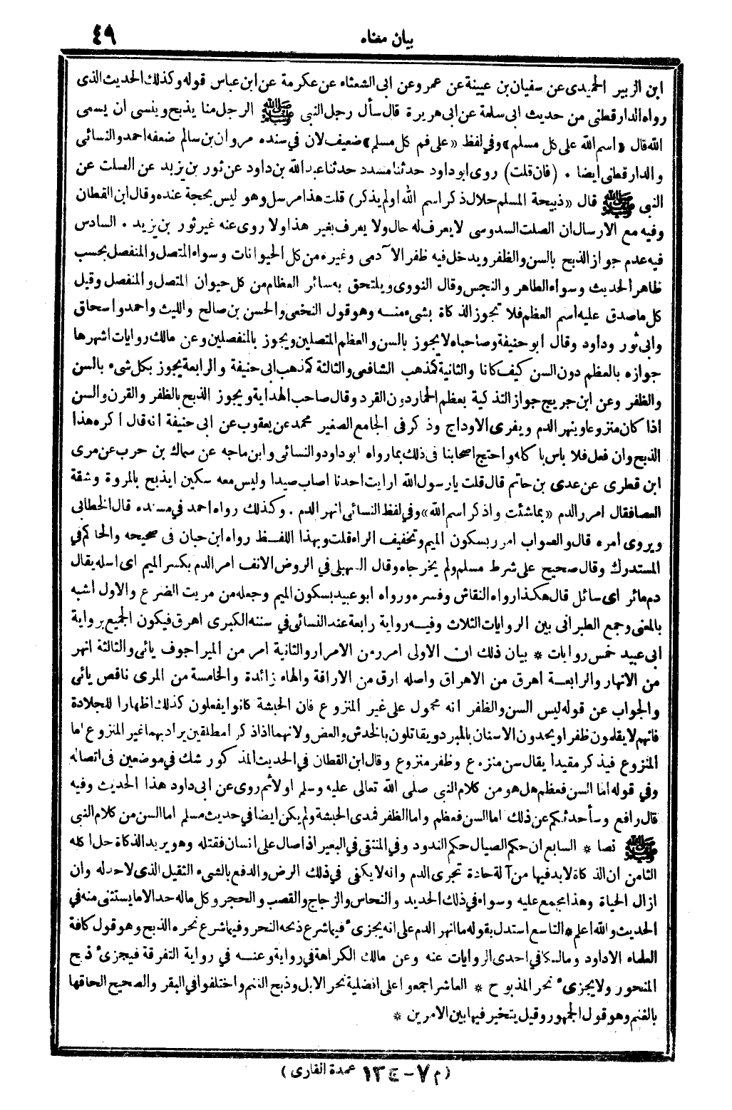السَّادِس: فِيهِ: عدم جَوَاز الذّبْح بِالسِّنِّ وَالظفر، وَيدخل فِيهِ ظفر الْآدَمِيّ وَغَيره من كل الْحَيَوَانَات، وَسَوَاء الْمُتَّصِل والمنفصل بِحَسب ظَاهر الحَدِيث، وَسَوَاء الطَّاهِر وَالنَّجس. وَقَالَ النَّوَوِيّ: ويلتحق بِهِ سَائِر الْعِظَام من كل حَيَوَان الْمُتَّصِل والمنفصل. وَقيل: كل مَا صدق عَلَيْهِ اسْم الْعظم فَلَا تجوز الذَّكَاة بِشَيْء مِنْهُ، وَهُوَ قَول النَّخعِيّ وَالْحسن بن صَالح وَاللَّيْث وَأحمد وَإِسْحَاق وَأبي ثَوْر وَدَاوُد، وَقَالَ أَبُو حنيفَة وصاحباه: لَا يجوز بِالسِّنِّ والعظم المتصلين، وَيجوز بالمنفصلين، وَعَن مَالك رِوَايَات أشهرها: جَوَازه بالعظم دون السن كَيفَ كَانَا، وَالثَّانيَِة كمذهب الشَّافِعِي، وَالثَّالِثَة كمذهب أبي حنيفَة، وَالرَّابِعَة: يجوز بِكُل شَيْء بِالسِّنِّ وَالظفر. وَعَن ابْن جريج جَوَاز التذكية بِعظم الْحمار دون القرد، وَقَالَ صَاحب (الْهِدَايَة) : وَيجوز الذّبْح بالظفر والقرن وَالسّن إِذا كَانَ منزوعاً وينهر الدَّم ويفري الْأَوْدَاج، وَذكر فِي (الْجَامِع الصَّغِير) : مُحَمَّد عَن يَعْقُوب عَن أبي حنيفَة أَنه قَالَ: أكره هَذَا الذّبْح وَإِن فعل فَلَا بَأْس بِأَكْلِهِ، وَاحْتج أَصْحَابنَا فِي ذَلِك بِمَا رَوَاهُ أَبُو دَاوُد وَالنَّسَائِيّ وَابْن مَاجَه عَن سماك بن حَرْب عَن مري ابْن قطري عَن عدي بن حَاتِم، قَالَ: قلت: يَا رَسُول الله! أَرَأَيْت أَحَدنَا أصَاب صيدا وَلَيْسَ مَعَه سكين، أيذبح بالمروة وشقة الْعَصَا؟ فَقَالَ: (أمرر الدَّم بِمَا شِئْت وَاذْكُر اسْم الله) . وَفِي لفظ النَّسَائِيّ: أنهر الدَّم. وَكَذَلِكَ رَوَاهُ أَحْمد فِي (مُسْنده) قَالَ الْخطابِيّ: ويروى: أمره، قَالَ: وَالصَّوَاب: أمرر، بِسُكُون الْمِيم وَتَخْفِيف الرَّاء. قلت: وَبِهَذَا اللَّفْظ رَوَاهُ ابْن حبَان فِي (صَحِيحه) وَالْحَاكِم فِي (الْمُسْتَدْرك) وَقَالَ: صَحِيح على شَرط مُسلم وَلم يخرجَاهُ، وَقَالَ السُّهيْلي فِي (الرَّوْض الْأنف) : أَمر الدَّم، بِكَسْر الْمِيم، أَي: أسله، يُقَال: دم مائر أَي: سَائل، قَالَ: هَكَذَا رَوَاهُ النقاش وَفَسرهُ، وَرَوَاهُ أَبُو عبيد بِسُكُون الْمِيم، وَجعله من: مريت الضَّرع وَالْأول أشبه بالمعني، وَجمع الطَّبَرَانِيّ بَين الرِّوَايَات الثَّلَاث، وَفِيه رِوَايَة رَابِعَة عِنْد النَّسَائِيّ فِي (سنَنه الْكُبْرَى) : أهرق، فَيكون الْجَمِيع بِرِوَايَة أبي عبيد خمس رِوَايَات. بَيَان ذَلِك: أَن الأولى: أمرر من الإمرار، وَالثَّانيَِة: أَمر من المير، أجوف يائي، وَالثَّالِثَة: أنهر، من الإنهار، وَالرَّابِعَة: أهرق، من الإهراق. وَأَصله: أرق من الإراقة، وَالْهَاء زَائِدَة. وَالْخَامِسَة: من المري، نَاقص يائي، وَالْجَوَاب عَن قَوْله: لَيْسَ السن وَالظفر، أَنه مَحْمُول على غير المنزوع، فَإِن الْحَبَشَة كَانُوا يَفْعَلُونَ كَذَلِك إِظْهَارًا للجلادة، فَإِنَّهُم لَا يقلمون ظفراً ويحدون الْأَسْنَان بالمبرد ويقاتلون بالخدش والعض، وَلِأَنَّهُمَا إِذا ذكرا مطلقين يُرَاد فيهمَا غير المنزوع، أما المنزوع فيذكر مُقَيّدا، يُقَال: سنّ منزوع وظفر منزوع، وَقَالَ ابْن الْقطَّان فِي الحَدِيث الْمَذْكُور: شكّ فِي موضِعين: فِي اتِّصَاله، وَفِي قَوْله: أما السن فَعظم، هَل هُوَ من كَلَام النَّبِي صلى الله عَلَيْهِ وَسلم أَو لَا؟ ثمَّ روى عَن أبي دَاوُد هَذَا الحَدِيث، وَفِيه: قَالَ رَافع: وَسَأُحَدِّثُكُمْ عَن ذَلِك، أما السن فَعظم، وَأما الظفر فمدى الْحَبَشَة، وَلم يكن أَيْضا فِي حَدِيث مُسلم. أما السن من كَلَام النَّبِي صلى الله عَلَيْهِ وَسلم نصا.