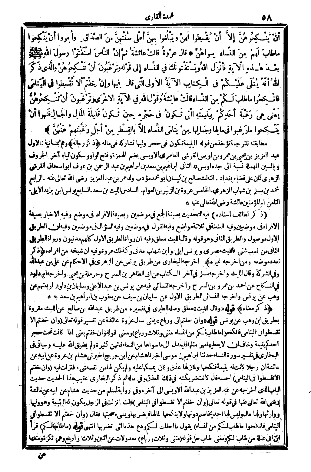 أنْ يَنْكِحُوهُنَّ إلاَّ أنْ يُقْسِطُوا لَهُنَّ ويَبْلُغُوا بِهِنَّ أعْلَى سُنَّتِهِنَّ مِنَ الصَّدَّاقِ وأُمِرُوا أنْ يَنْكِحُوا مَا طابَ لَهمْ مِنَ النِّسَاءِ سِواهُنَّ. قَالَ عُرْوةُ قالتْ عائِشَةُ ثمَّ إنَّ النَّاسَ اسْتَفْتَوْا رسولَ الله صلى الله عَلَيْهِ وَسلم بعْدَ هاذِهِ الآيَةِ فأنْزَلَ الله {ويَسْتَفْتُونَكَ فِي النِّسَاءِ} إِلَى قَوْلِهِ {وتَرْغَبُونَ أنْ تَنْكِحُوهُنَّ} والَّذِي ذَكَرَ الله أنَّهُ يُتْلَى عَلَيْكُمْ فِي الكِتَابِ الآيَةُ الأُولَى الَّتي قَالَ فِيها وإنْ خِفْتُمْ أَلا تُقْسِطُوا فِي اليَتَامَى فانْكِحُوا مَا طابَ لَكُمْ مِنَ النِّساءِ قالَتْ عائِشَةُ وقَوْل الله فِي الآيةِ الأخْرَى وتَرْغَبُونَ أنْ تَنْكِحُوهُنَّ يَعْني هِيَ رَغْبَة أحَدِكُمْ بَيَتيمَتِه الَّتي فِي حَجْرِه حِينَ تَكُونُ قَليلَةَ الْمَالِ والْجَمَالِ فَنهوا أنْ يَنْكِحُوا مَا رَغِبُوا فِي مالِها وجَمالِها مِنْ يَتامَى النِّساءِ إلاَّ بالْقِسْطِ مِنْ أجْلِ رَغْبَتِهِمْ عَنْهُنَّ (النِّسَاء: 721) ..