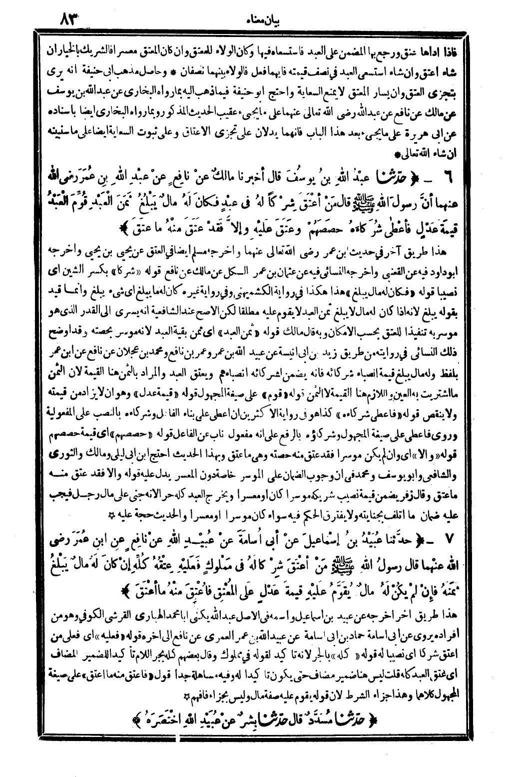 هَذَا طَرِيق آخر أخرجه عَن عبيد بن إِسْمَاعِيل واسْمه فِي الأَصْل: عبد الله، يكنى: أَبَا مُحَمَّد الْهَبَّاري الْقرشِي الْكُوفِي، وَهُوَ من أَفْرَاده، يروي عَن أبي أُسَامَة حَمَّاد بن أبي أُسَامَة عَن عبيد الله بن عمر الْعمريّ عَن نَافِع إِلَى آخِره. قَوْله: (فَعَلَيهِ) أَي: فعلى من أعتق شركا، أَي: نَصِيبا لَهُ. قَوْله: (كُله) ، بِالْجَرِّ لِأَنَّهُ تَأْكِيد لقَوْله فِي: مَمْلُوك، وَقَالَ بَعضهم: كُله، بجر اللَّام تَأْكِيدًا للضمير الْمُضَاف، أَي: عتق العَبْد كُله. قلت: لَيْسَ هُنَا ضمير مُضَاف حَتَّى يكون تَأْكِيدًا لَهُ، وَفِيه مساهلة جدا. قَوْله: (فَأعتق مِنْهُ مَا أعتق) ، على صِيغَة الْمَجْهُول كِلَاهُمَا، وَهَذَا جَزَاء الشَّرْط، لِأَن قَوْله: يقوم عَلَيْهِ، صفة مَال وَلَيْسَ بجزاء، فَافْهَم.