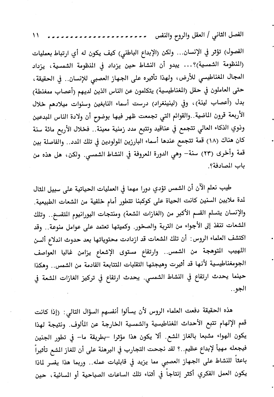الفصول) تؤثر في الإنسان ... ولكن (الإبداع الباطني) كيف يكون له أي ارتباط بعمليات (المنظومة الشمسية)؟ ... يبدو أن النشاط حين يزداد في المنظومة الشمسية، يزداد المجال المغناطيسي للأرض، ولهذا تأثيره على الجهاز العصبي للإنسان .. في الحقيقة، حتى العاملون في حقل (المغناطيسية) يتكلمون عن الناس الذين لديهم (أعصاب ممغنطة) بدل (أعصاب لينة)، وفي (لينينغراد) درست أسماء النابغين وسنوات ميلادهم خلال الأربعة قرون الماضية .. والقوائم التي تجمعت ظهر فيها بوضوح أن ولادة الناس المبدعين وذوي الذكاء العالي تتجمع في عناقيد وتتبع مدد زمنية معينة .. فخلال الأربع مائة سنة كان هناك (18) قمة تتجمع عندها أسماء البارزين المولودين في تلك المدد .. والفاصلة بين قمة وأخرى (23) سنة - وهي الدورة المعروفة في النشاط الشمسي. ولكن، هل هذه من باب المصادفة؟.