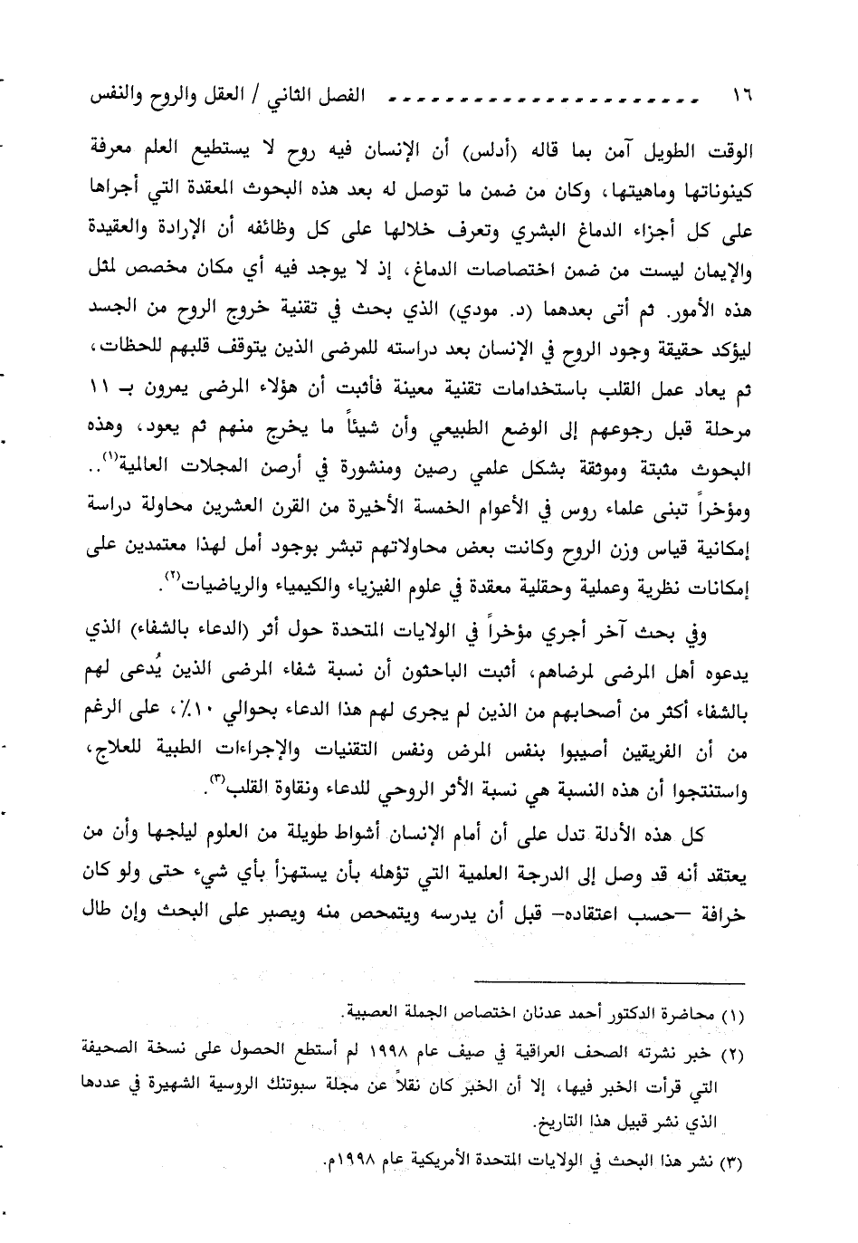 الوقت الطويل آمن بما قاله (أدلس) أن الإنسان فيه روح لا يستطيع العلم معرفة كينوناتها وماهيتها، وكان من ضمن ما توصل له بعد هذه البحوث المعقدة التي أجراها على كل أجزاء الدماغ البشري وتعرف خلالها على كل وظائفه أن الإرادة والعقيدة والإيمان ليست من ضمن اختصاصات الدماغ، إذ لا يوجد فيه أي مكان مخصص لمثل هذه الأمور. ثم أتى بعدهما (د. مودي) الذي بحث في تقنية خروج الروح من الجسد ليؤكد حقيقة وجود الروح في الإنسان بعد دراسته للمرضى الذين يتوقف قلبهم للحظات، ثم يعاد عمل القلب باستخدامات تقنية معينة فأثبت أن هؤلاء المرضى يمرون ب 11 مرحلة قبل رجوعهم إلى الوضع الطبيعي وأن شيئا ما يخرج منهم ثم يعود، وهذه البحوث مثبتة وموثقة بشكل علمي رصين ومنشورة في أرصن المجلات العالمية «1» ..