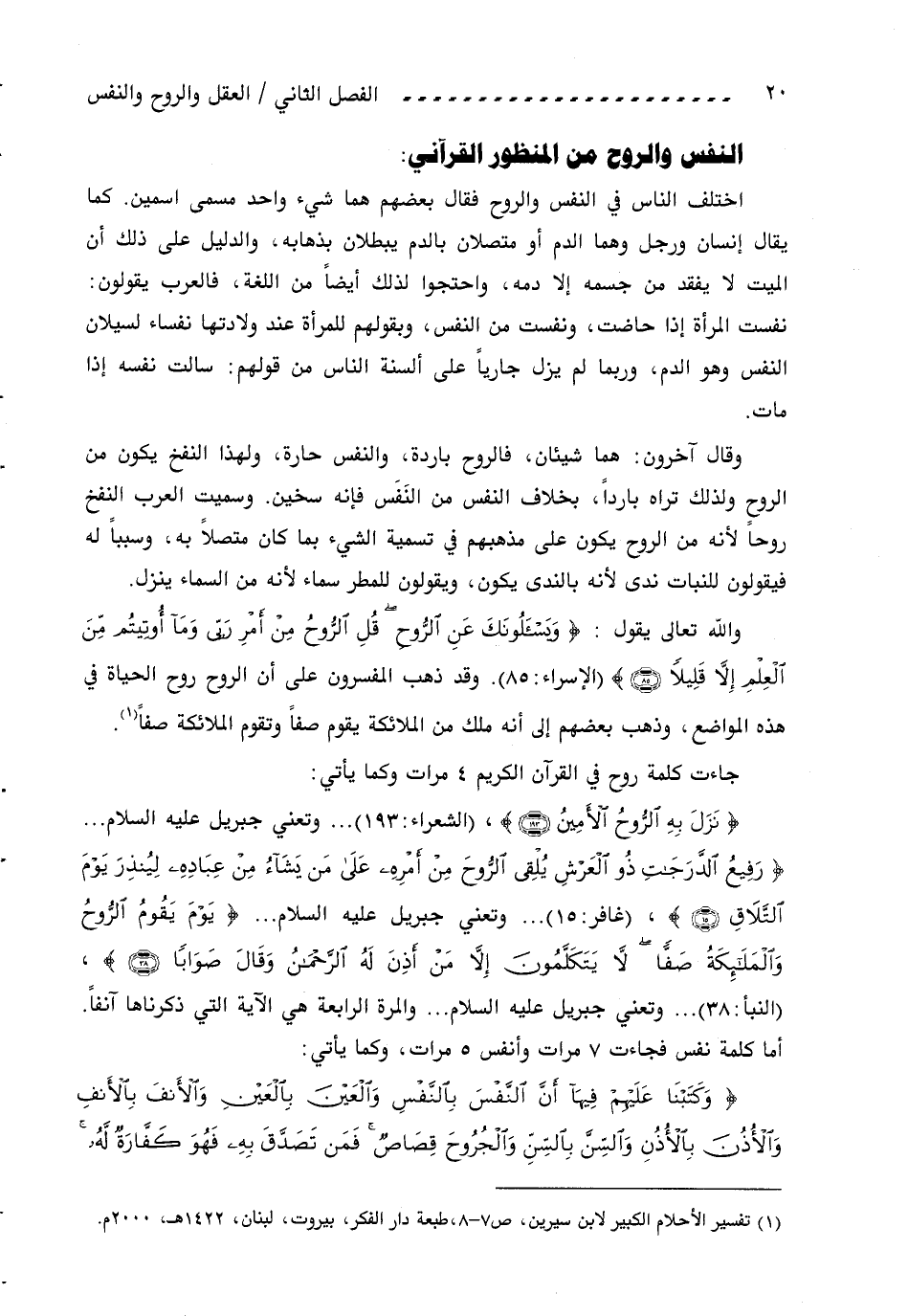 واللّه تعالى يقول: ويَسْئَلُونَكَ عَنِ الرُّوحِ قُلِ الرُّوحُ مِنْ أَمْرِ رَبِّي وما أُوتِيتُمْ مِنَ الْعِلْمِ إِلَّا قَلِيلًا (85) (الإسراء: 85). وقد ذهب المفسرون على أن الروح روح الحياة في هذه المواضع، وذهب بعضهم إلى أنه ملك من الملائكة يقوم صفا وتقوم الملائكة صفا «1».