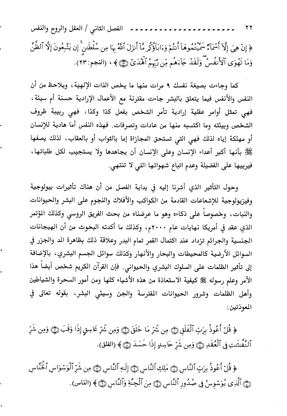 كما وجاءت بصيغة نفسك 9 مرات منها ما يخص الذات الإلهية، ويلاحظ من أن النفس والأنفس فيما يتعلق بالبشر جاءت مقترنة مع الأعمال الإرادية حسنة أم سيئة، فهي تمثل أوامر عقلية إرادية تأمر الشخص بفعل كذا وكذا، فهي ربيبة ظروف الشخص وبيئته وما اكتسبه منها من عادات وتصرفات. فهذه النفس أما هادية للإنسان أو مهلكة إياه لذلك فهي التي تستحق المجازاة إما بالثواب أو بالعقاب، لذلك يصفها صلّى اللّه عليه وسلّم بأنها أكبر أعداء الإنسان وعلى الإنسان أن يجاهدها ولا يستجيب لكل طلباتها، فيربيها على الفضيلة وعدم اتباع شهواتها التي لا تنتهي.