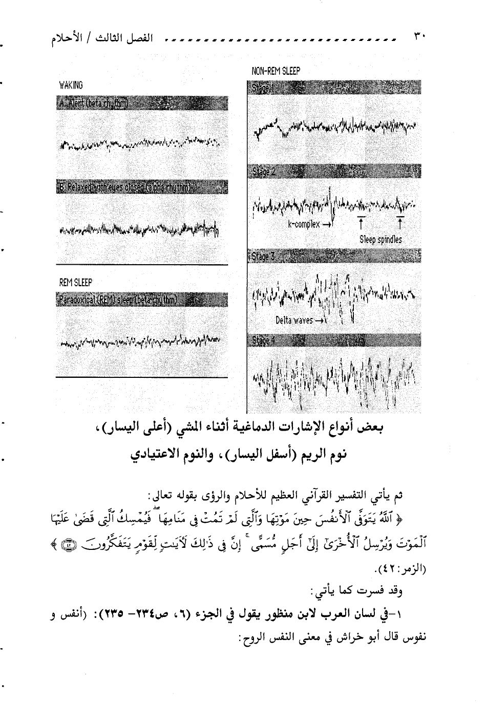 بعض أنواع الإشارات الدماغية أثناء المشي (أعلى اليسار)، نوم الريم (أسفل اليسار)، والنوم الاعتيادي ثم يأتي التفسير القرآني العظيم للأحلام والرؤى بقوله تعالى: