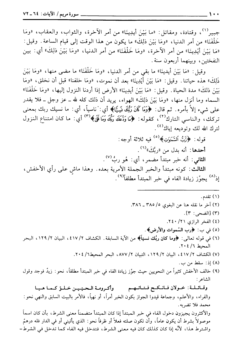 وقيل:» مَا بَيْنَ أدينَا «ما بقي من أمر الدنيا،» ومَا خَلْفَنَا «ما مضى منها،» ومَا بَيْنَ ذَلِكَ «هذه حياتنا. وقيل:: مَا بَيْنَ أيْدِينَا» بعد أن نموت، «ومَا بَيْن ذلكَ» مدة الحياة. وقيل: «مَا بَيْنَ أيدِينَا» الأرض إذا أردنا النزول إليها، «ومَا خَلْفَنَا» السماء وما أنزل منها، «ومَا بَيْنَ ذلِكَ» الهواء، يريد أن ذلك كله لله - عَزَّ وَجَلَّ - فلا يقدر على شيء إلاَّ بأمره. ثم قال: {وَمَا كَانَ رَبُّكَ نَسِيّاً} أي: ناسياً، أي: ما نسيك ربك بمعنى تركك، والناسي التارك، كقوله: {مَا وَدَّعَكَ رَبُّكَ وَمَا قلى} [الضحى: 3] أي: ما كان امتناع النزول لترك الله لك وتوديعه إياك.