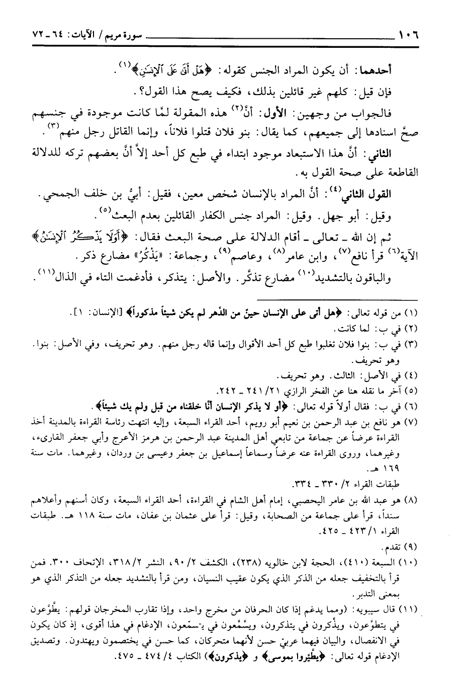 ثم إن الله - تعالى - أقام للدلالة على صحة البعث فقال: {أَوَلاَ يَذْكُرُ إلإِنْسَانُ} الآية قرأ نافع، وابن عامر، وعاصم، وجماعة: «يَذْكُرُ» مضارع ذكر.