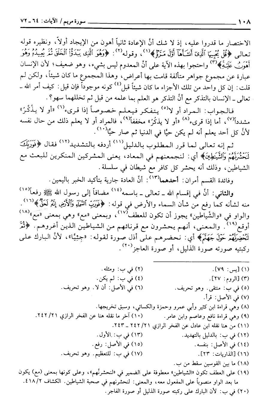 والثاني: أنَّ في قسام الله - تعالى - باسمه مضافاً إلى رسول الله صَلَّى اللَّهُ عَلَيْهِ وَسَلَّم َ رفعاً منه لشأنه كما رفع من شأن السماء والأرض في قوله: {فَوَرَبِّ السمآء والأرض إِنَّهُ لَحَقٌّ} [الذاريات: 23] . والواو في «والشَّياطين» يجوز أن تكون للعطف، وبمعنى «مع» وهي بمعنى «مع» أوقع. والمعنى، أنهم يحشرون مع قرنائهم من الشياطين الذين أغروهم. {ثُمَّ لَنُحْضِرَنَّهُمْ حَوْلَ جَهَنَّمَ} أي: نحضرهم على أذل صورة لقوله: «جِثِيًّا» لأنَّ البارك على ركبتيه صورته الذليل، أو صورة العاجز.