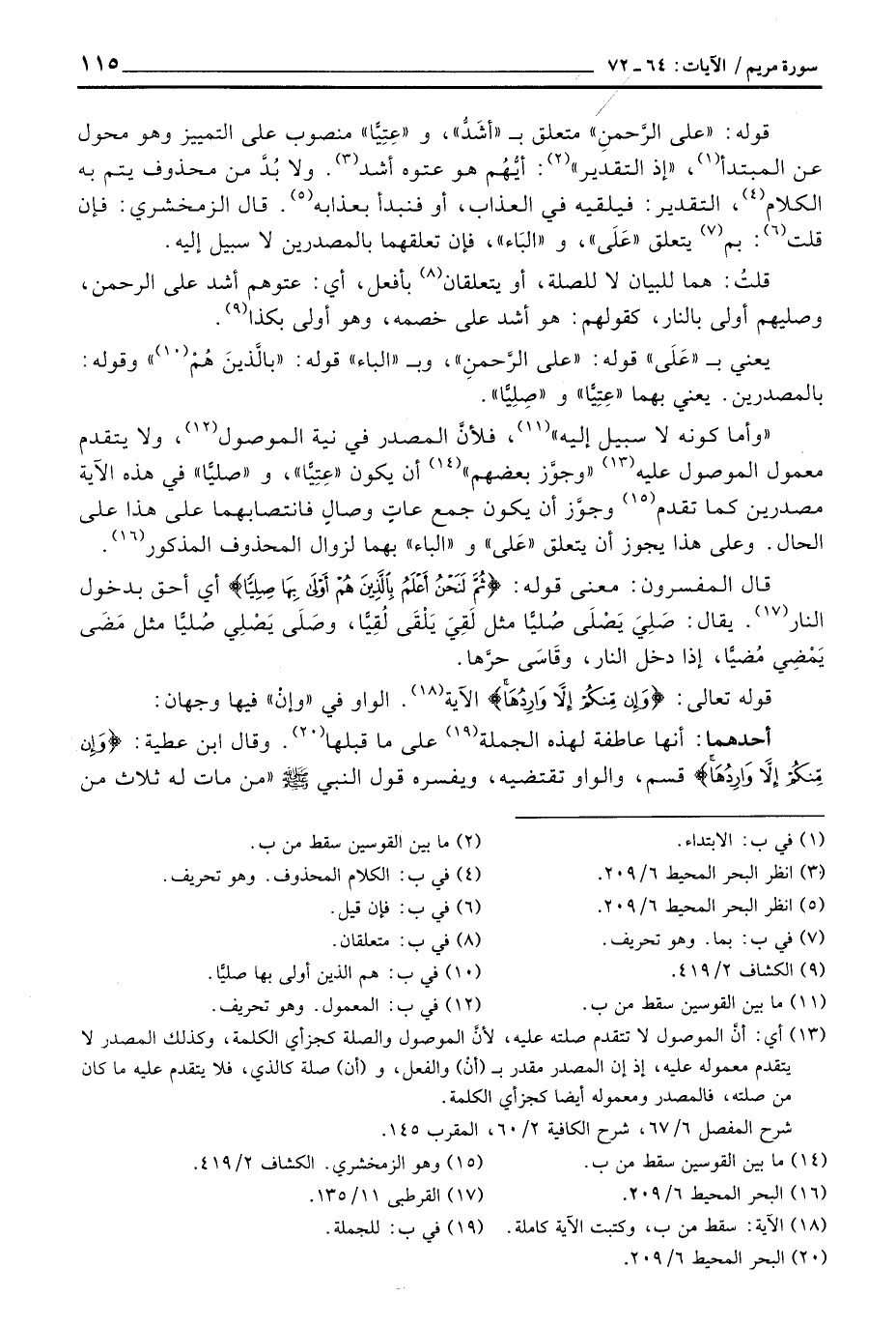 » وأما كونه لا سبيل إليه «، فلأن المصدر في نية الموصول، ولا يتقدم معمول الموصول عليه» وجوَّز بعضهم «أن يكون» عِتِيًّا «، و» صليًّا «في هذه الآية مصدرين كما تقدم وجوَّز أن يكون جمع عاتٍ وصالٍ فانتصابهما على هذا الحال. وعلى هذا يجوز أن يتعلق» عَلَى «و» الباء «بهما لزوال المحذوف المذكور.