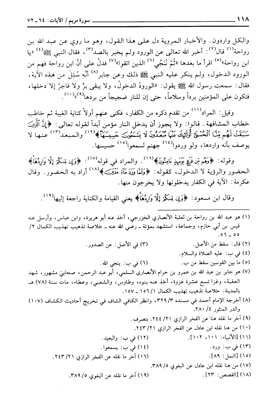 «روي عن عبد الله بن رواحة قال: أخبر الله تعالى عن الورود ولم يخبر بالصد، فقال النبي صَلَّى اللَّهُ عَلَيْهِ وَسَلَّم َ» يا ابن رواحة «اقرأ ما بعدها» ثُمَّ نُنَجِّي الذين اتقوا «فدلَّ على أنَّ ابن رواحة فهم من الورود الدخول، ولم ينكر عليه النبي صَلَّى اللَّهُ عَلَيْهِ وَسَلَّم َ ذلك وعن جابر أنَّه سُئِلَ عن هذه الآية، فقال: سمعت رسول الله صَلَّى اللَّهُ عَلَيْهِ وَسَلَّم َ يقول:» الورودُ الدخولُ، ولا يبقى بردٌّ ولا فاجرٌ إلا دخلها، فتكون على المؤمنين برداً وسلاماً، حتى إن للنار ضجيجاً من بردها «.