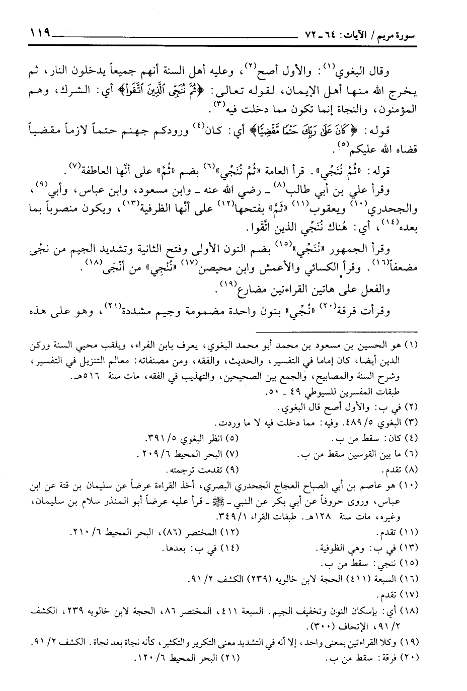 وقال البغوي: والأول أصح، وعليه أهل السنة أنهم جميعاً يدخلون النار، ثم يخرج الله منها أهل الإيمان، لقوله تعالى: {ثُمَّ نُنَجِّي الذين اتقوا} أي: الشرك، وهم المؤمنون، والنجاة إنما تكون مما دخلت فيه.