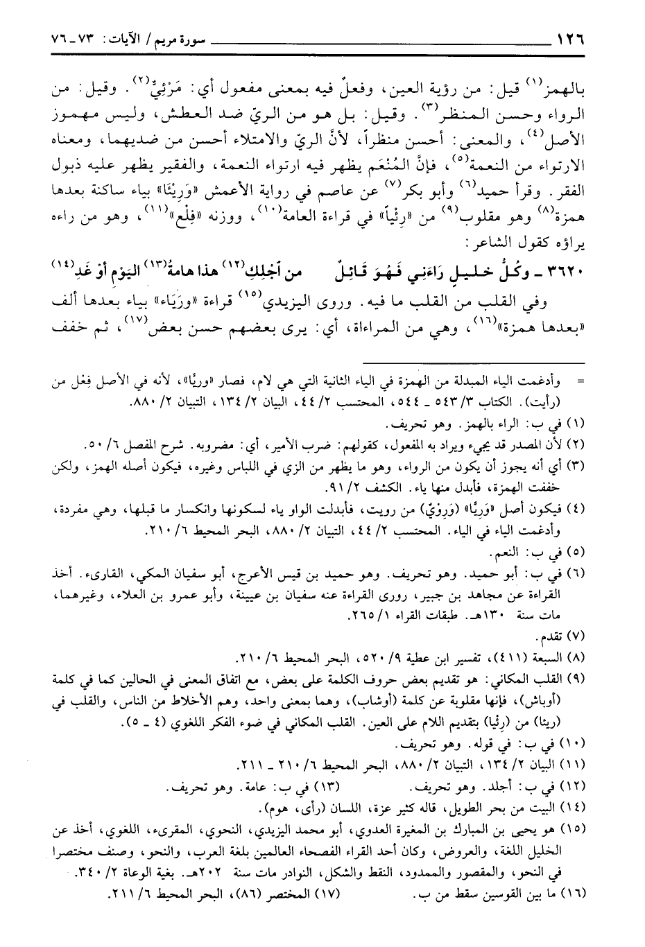بالهمز وقيل: من رؤية العين، وفعلٌ فيه معنى مفعول أي: مَرْئِيٌّ. وقيل: من الرواء وحسن المنظر. وقيل: بل هو من الريّ ضد العطش، وليس مهموز الأصل، والمعنى: أحسن منظراً، لأنَّ الريّ والامتلاء أحسن من ضديهما، ومعناه الارتواء من النعمة، فإنَّ المُنْعم يظهر فيه ارتواء النعمة، والفقير يظهر عليه ذبول الفقر. وقرأ حميد وأبو بكر عن عاصم في رواية الأعمش: وَرِيْئَا» بياء ساكنة بعدها همزة وهو مقلوب من «رِئْياً» في قراءة العامة، ووزنه «فِلْع» ، وهو من وراءه يراؤه كقول الشاعر: