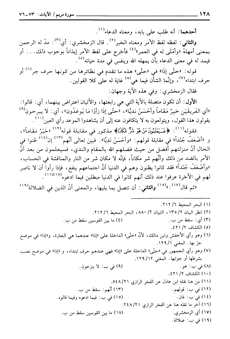الأول: أن تكون متصلة بالآية التي هي رابعتها، والآيتان اعتراض بينهما، أي: قالوا: «أي الفَريقِيْنِ خيرٌ مقَاماً وأحْسَنُ نديًّا» ، «حتَّى إذَا رَأوْا ما يُوعَدُون» ، أي: لا يبرحون يقولون هذا القول، ويتولعون به لا يتكافون عنه إلى أن يشاهدوا الموعد رأي العين.