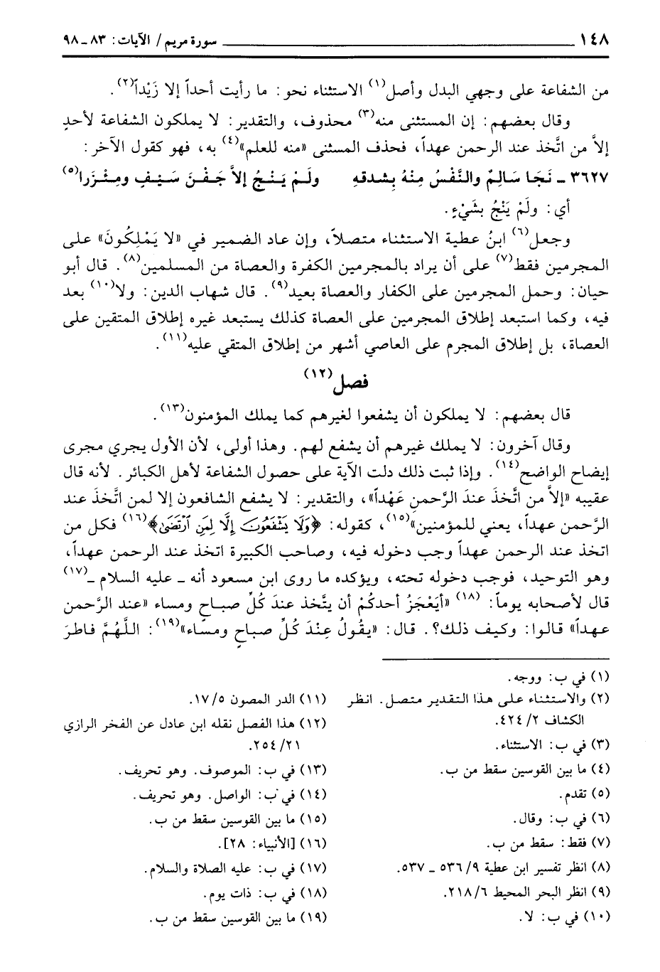 وجعل ابنُ عطية الاستثناء متصلاً، وإن عاد الضمير في «لا يَمْلِكُون» على المجرمين فقط على أن يراد بالمجرمين الكفرة والعصاة من المسلمين. قال أبو حيان: وحمل المجرمين على الكفار والعصاة بعيد. قال شهاب الدين: ولا بعد فيه، وكما استبعد إطلاق المجرمين على العصاة كذلك يستبعد غيره إطلاق المتقين على العصاة، بل إطلاق المجرم على العاصي أشهر من إطلاق المتقي عليه.