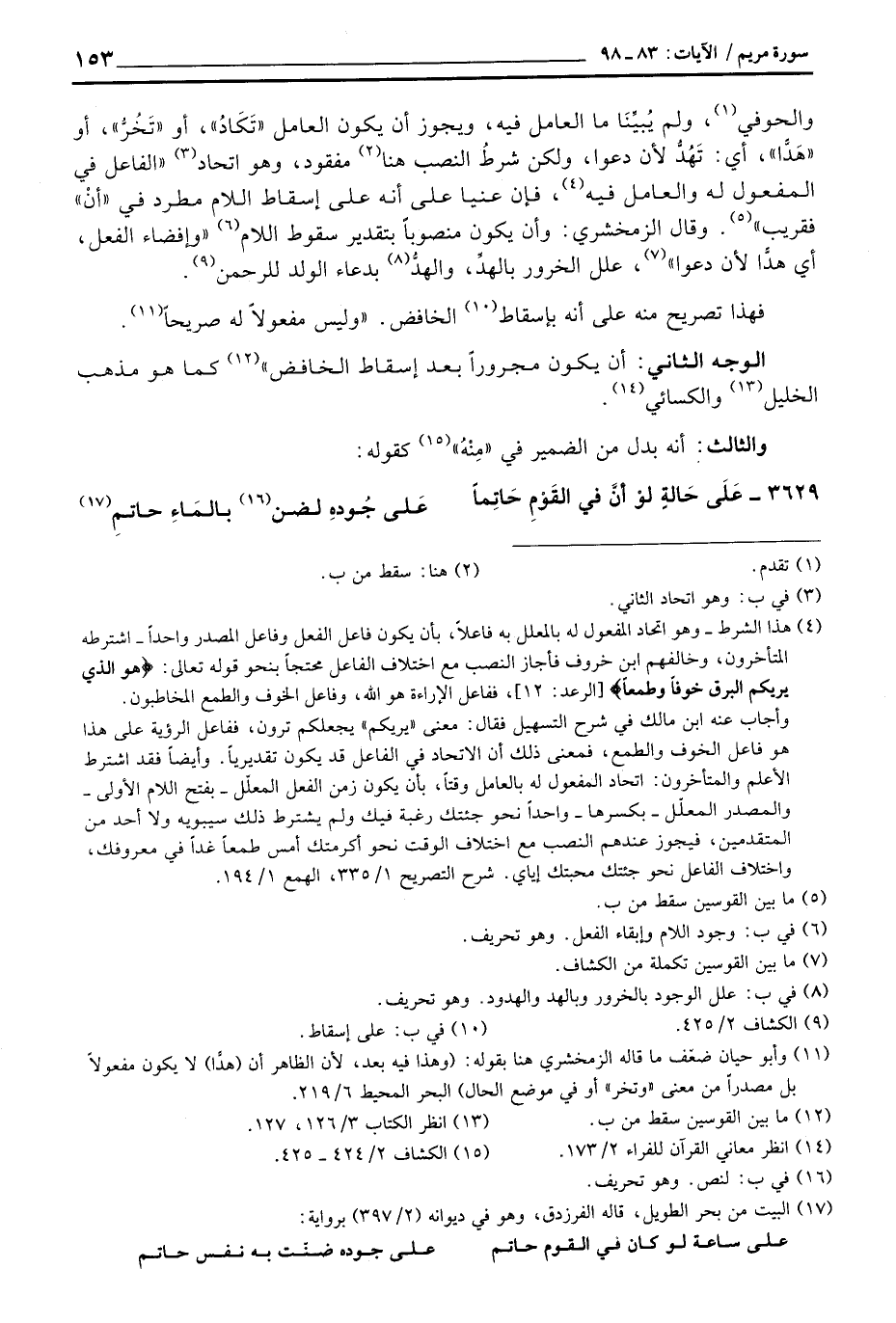 والحوفي، ولم يُبيِّنَا ما العامل فيه، ويجوز أن يكون العامل «تَكَادُ» ، أو «تَخُرُّ» ، أو «هَدَّا» ، أي: تَهُدُّ لأن دعوا، ولكن شرطُ النصب هنا مفقود، وهو اتحاد «الفاعل في المفعول له والعامل فيه، فإن عنيا على أنه على إسقاط اللام مطرد في» أنْ «فقريب» . وقال الزمخشري: وأن يكون منصوباً بتقدير سقوط اللام «وإفضاء الفعل، أي هدَّا أن دعوا» ، علل الخرور بالهدِّ، والهدُّ بدعاء الولد للرحمن.