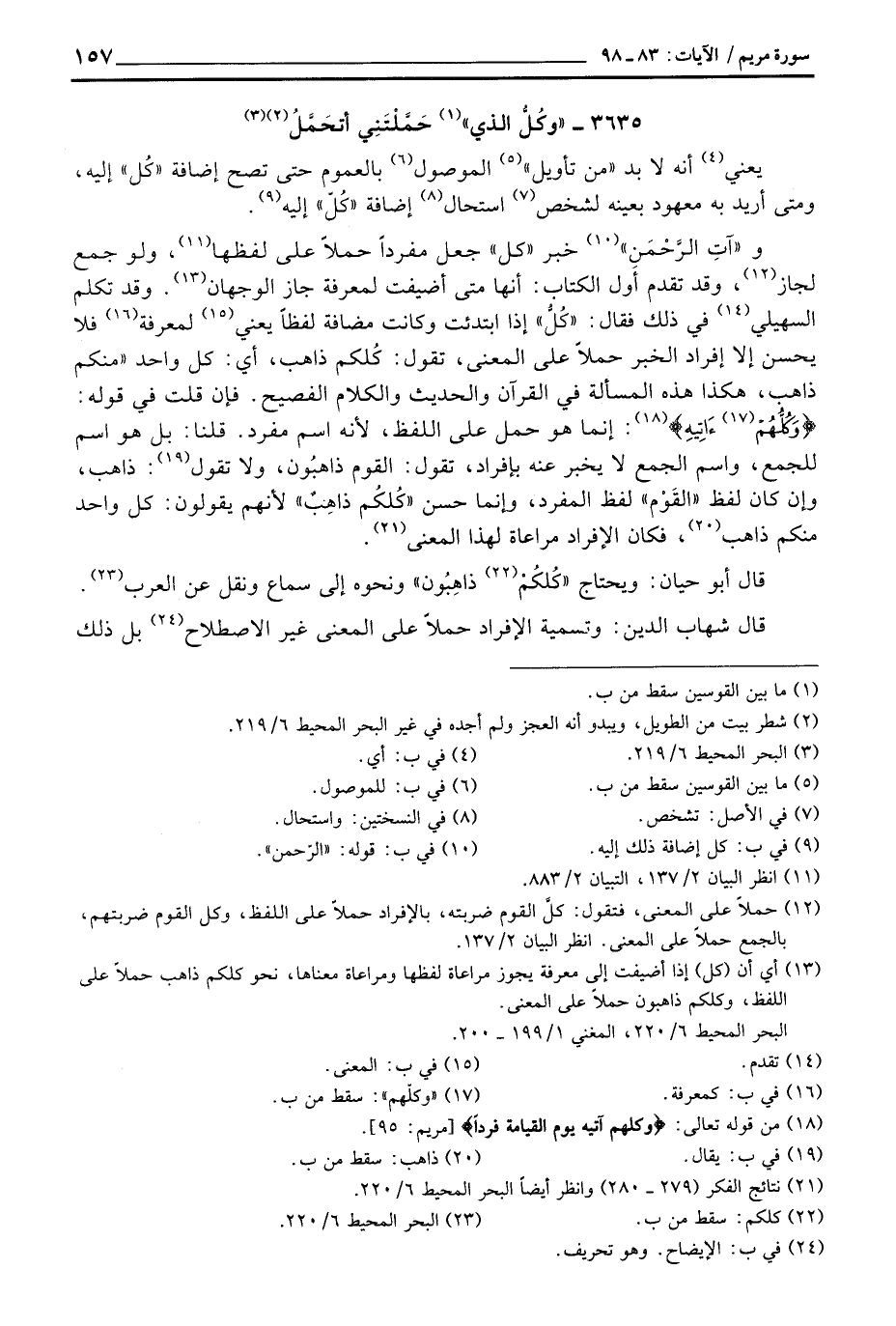 و» آتِ الرَّحْمَنِ «خبر» كل «جعل مفرداً حملاً على لفظها، ولو جمع لجاز، وقد تقدم أول الكتاب: أنها متى أضيفت لمعرفة جاز الوجهان. وقد تكلم السهيلي في ذلك فقال:» كُلُّ «إذا ابتدئت وكانت مضافة لفظاً يعني لمعرفة فلا يحسن إلا أفراد الخبر حملاً على المعنى، تقول: كُلكم ذاهب، أي: كل واحد» منكم ذاهب، هكذا هذه المسألة في القرآن والحديث والكلام الفصيح. فإن قلت في قوله: {وَكُلُّهُمْ آتِيهِ} : إنما هو حمل على اللفظ، لأنه اسم مفرد. قلنا: بل هو اسم للجمع، واسم الجمع لا يخبر عنه بإفراد، تقول: القوم ذاهبُون، ولا تقول: ذاهب، وإن كان لفظ «القَوْم» لفظ المفرد، وإنما حسن «كُلكُم ذاهِبٌ» لأنهم يقولون: كل واحد منكم ذاهب، فكان الإفراد مراعاة لهذا المعنى.