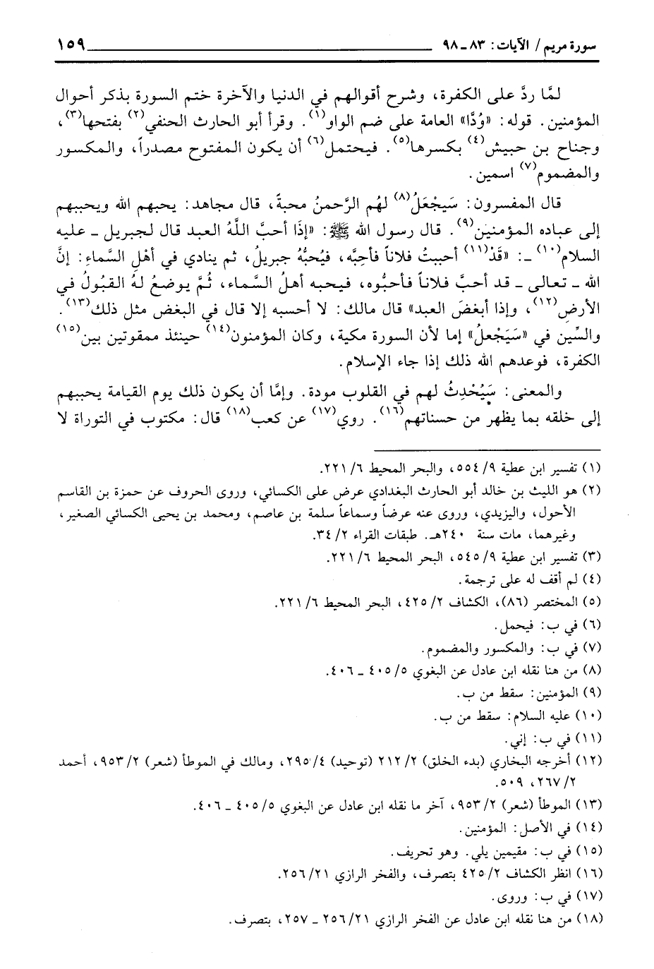 لمَّا ردَّ على الكفرة، وشرح أقوالهم في الدنيا والآخرة ختم السورة بذكر أحوال المؤمنين. قوله: «وُدَّا» العامة على ضم الواو. وقرأ أبو الحارث الحنفي بفتحها، وجناح بن حبيش بكسرها. فيحتمل أن يكون المفتوح مصدراً، والمكسور والمضموم اسمين.
