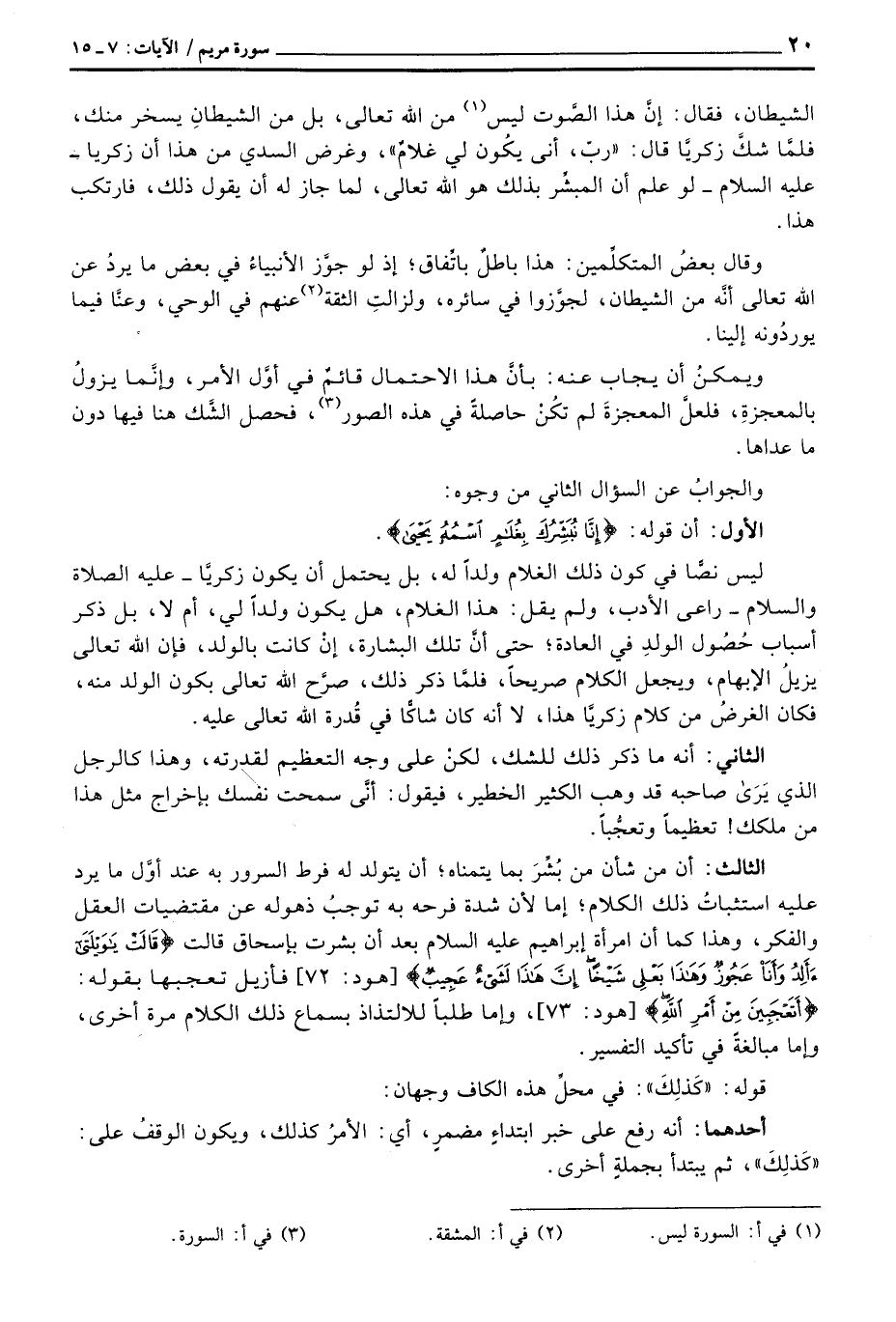 الشيطان، فقال: إنَّ هذا الصَّوت ليس من الله تعالى، بل من الشيطانِ يسخر منك، فلمَّا شكَّ زكريَّا قال: «ربّ، أني يكُون لي غلامٌ» ، وغرض السدي من هذا أن زكريا - عليه السلام - لو علم أن المبشَّر بذلك هو الله تعالى، لما جاز له أن يقول ذلك، فارتكب هذا.