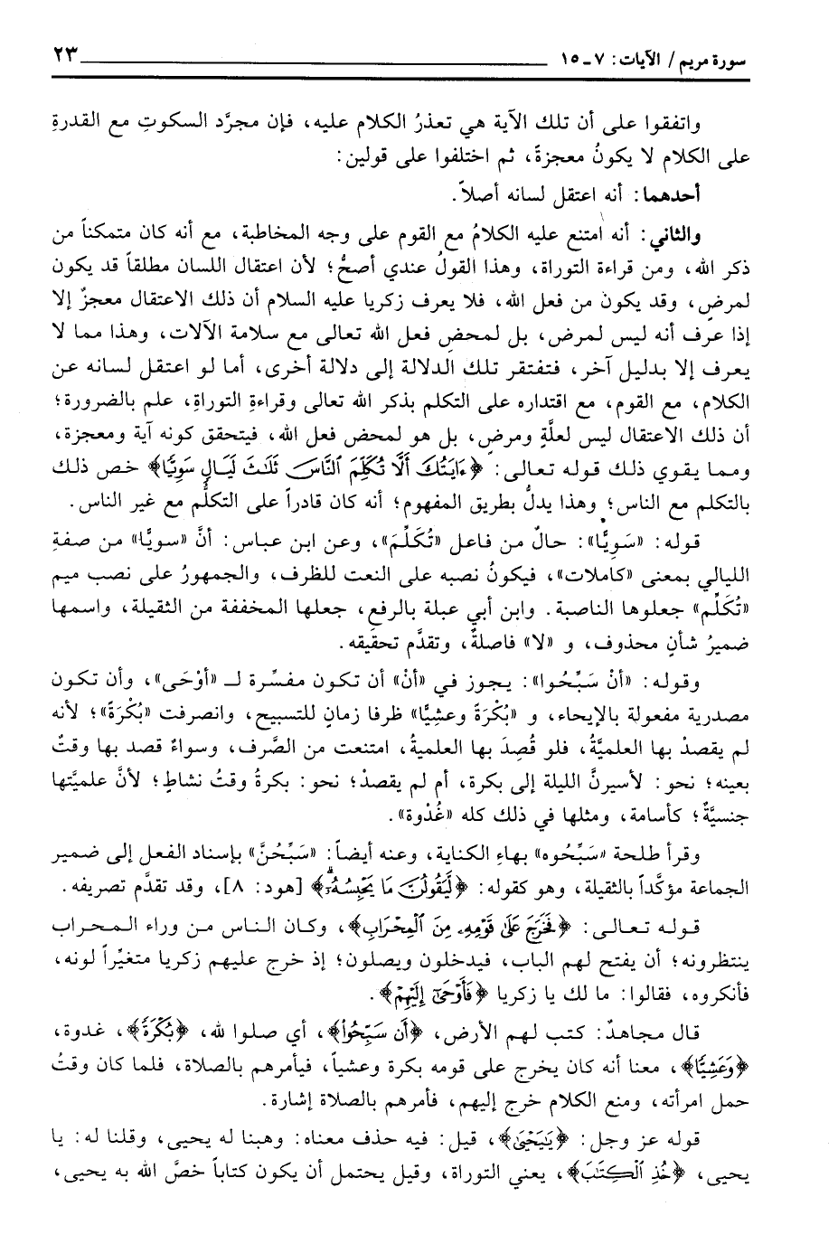 والثاني: أنه امتنع عليه الكلامُ مع القوم على وجه المخاطبة، مع أنه كان متمكناً من ذكر الله، ومن قراءة التوراة، وهذا القولُ عندي أصحُّ؛ لأن اعتقال اللسان مطلقاً قد يكون لمرضٍ، وقد يكون من فعل الله، فلا يعرف زكريا عليه السلام أن ذلك الاعتقال معجزٌ إلا إذا عرف أنه ليس لمرض، بل لمحضِ فعل الله تعالى مع سلامة الآلات، وهذا مما لا يعرف إلا بدليل آخر، فتفتقر تلك الدلالة إلى دلالة أخرى، أما لو اعتقل لسانه عن الكلام، مع القوم، مع اقتداره على التكلم بذكر الله تعالى وقراءةِ التوراةِ، علم بالضرورة؛ أن ذلك الاعتقال ليس لعلَّةٍ ومرضٍ، بل هو لمحض فعل الله، فيتحقق كونه آية ومعجزة، ومما يقوي ذلك قوله تعالى: {آيَتُكَ أَلاَّ تُكَلِّمَ الناس ثَلاَثَ لَيَالٍ سَوِيّاً} خص ذلك بالتكلم مع الناس؛ وهذا يدلُّ بطريق المفهوم؛ أنه كان قادراً على التكلم مع غير الناس.