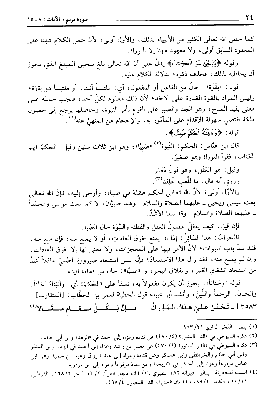 قال ابن عبَّاس: الحكم: النُّبوة «صَبِيًّا» ؛ وهوابن ثلاث سنين وقيل: الحكمُ فهم الكتاب، فقرأ التوراة وهو صغيرٌ.
