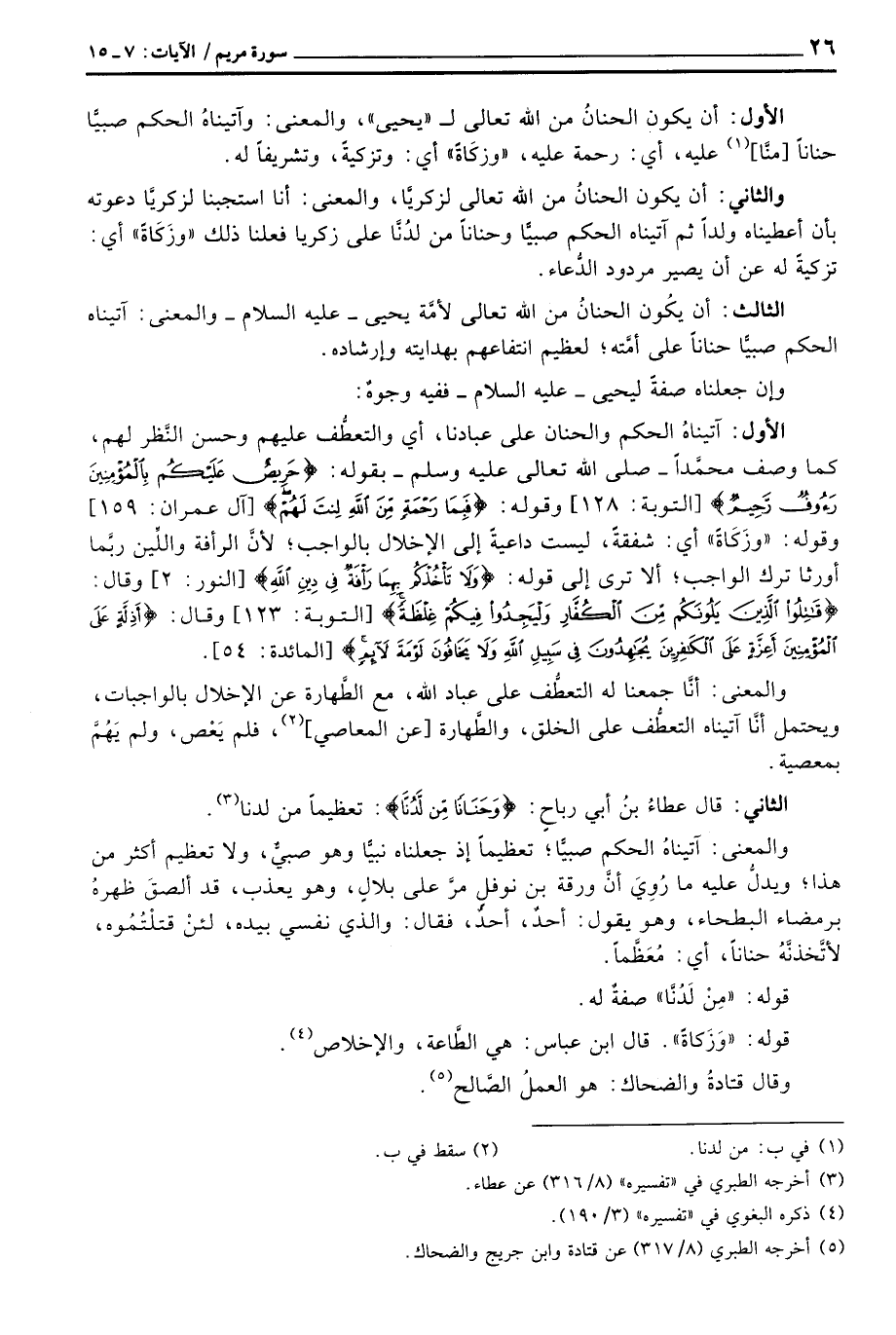 الأول: آتيناهُ الحكم والحنان على عبادنا، أي والتعطُّف عليهم وحسن النَّظر لهم، كما وصف محمَّداً - صَلَّى اللَّهُ عَلَيْهِ وَسَلَّم َ - بقوله: