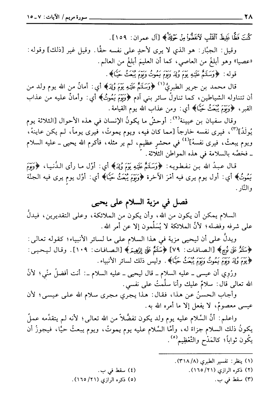 واعلم: أنَّ السَّلام عليه يوم ولد يكون تفضُّلاً من الله تعالى؛ لأنه لم يتقدَّمه عملٌ يكونُ ذلك السلام جزاءً له، وأمَّا السَّلام عليه يوم يموتُ، ويوم يبعثُ حيَّاً، عملٌ يكونُ ذلك السلام جزاءً له، وأمَّا السَّلام عليه يوم يموتُ، ويوم يبعثُ حيًّا فيجوزُ أن يكُون ثواباً؛ كالمَدْح والتَّعْظِيم.