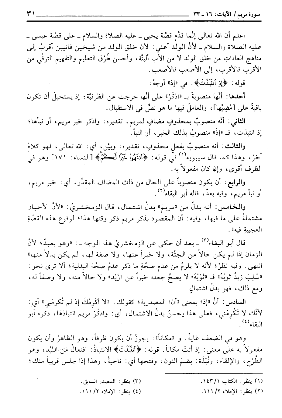 الثاني: أنَّه منصوبٌ بمحذوفٍ مضافٍ لمريم، تقديره: واذكر خبر مريم، أو نبأها؛ إذا انتبذت، ف «إذْ» منصوبٌ بذلك الخبر، أو النبأ.