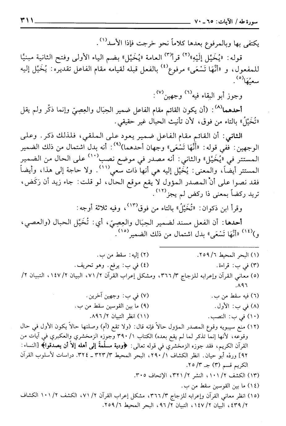 الثاني: أن القائم مقام الفاعل ضمير يعود على الملقي، فلذلك ذكر. وعلى الوجهين: ففي قوله: «أنَّهَا تَسْعَى» وجهان أحدهما) : أنه بدل اشتمال من ذلك الضمير المستتر أيضاً، والمعنى: يُخَيَّل إليه هي أنها ذات سعي. ولا حاجة إلى هذا، وأيضاً فقد نصوا على أن المصدر المؤول لا يقع موقع الحال، لو قلت: جاء زيد أن رَكَض، تريد ركضاً بمعنى ذا ركض لم يجز.