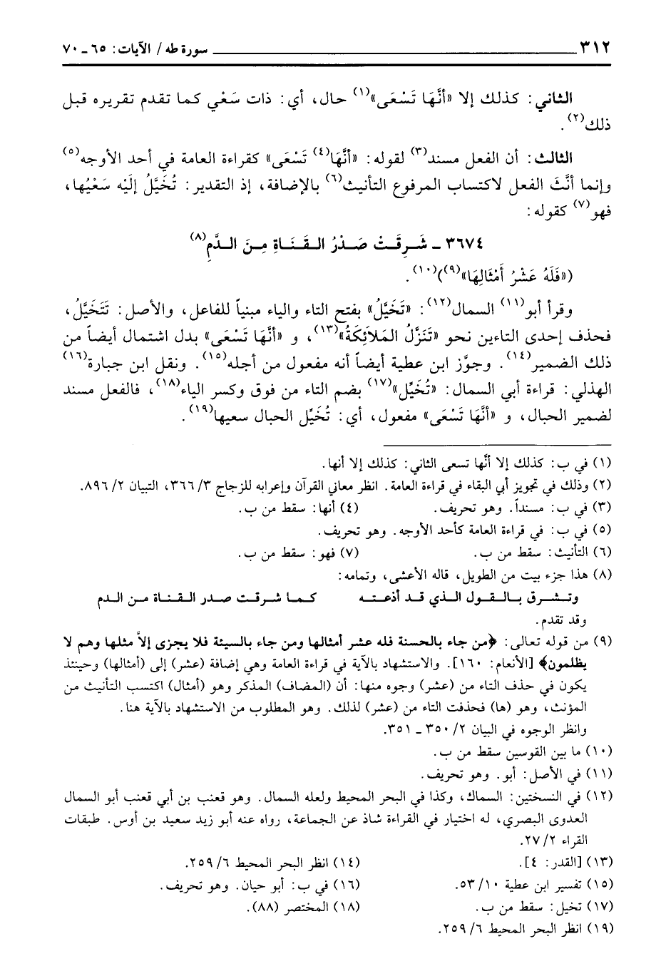وجوَّز ابن عطية أيضاً أنه مفعول من أجله. ونقل ابن جبارة الهذلي: قراءة أبي السمال: «تُخَيِّل» بضم التاء من فوق وكسر الياء، فالفعل مسند لضمير الحبال، و «أنَّهَا تَسْعَى» مفعول، أي: تُخَيَّل الحبال سعيها.