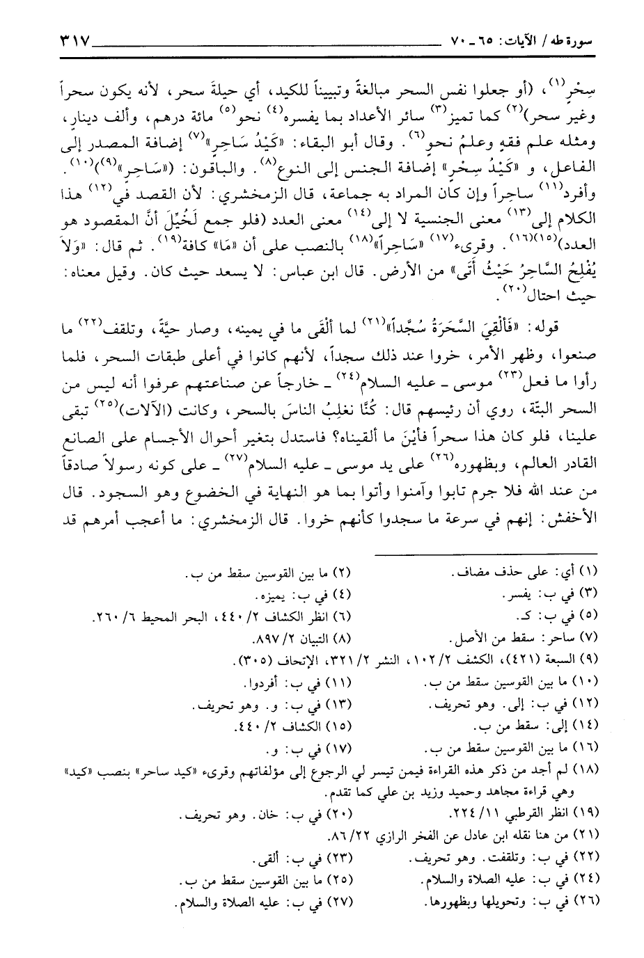 سِحْرٍ، (أو جعلوا نفس السحر مبالغةً وتبييناً للكيد، أي حيلةَ سحر، لأنه يكون سحراً وغير سحر) كما تميز سائر الأعداد بما يفسره نحو مائة درهم، وألف دينار، ومثله علم فقهٍ وعلمُ نحوٍ. وقال أبو البقاء: «كَيْدُ سَاحِرٍ» إضافة المصدر إلى الفاعل، و «كَيْدُ سِحْرٍ» إضافة الجنس من النوع. والباقون: ( «سَاحِرٍ» ) .