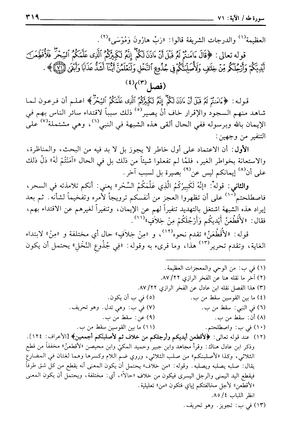 والثاني: قوله: {إِنَّهُ لَكَبِيرُكُمُ الذي عَلَّمَكُمُ السحر} يعني: أنكم تلامذته في السحر، فاصطلحتم على أن تظهروا العجز من أنفسكم ترويجاً لأمره وتفخيماً لشأنه. ثم بعد إيراد هذه الشبهة اشتغل بالتهديد تنفيراً لهم عن الإيمان، وتنفيراً لغيرهم عن الاقتداء بهم، فقال: {فَلأُقَطِّعَنَّ أَيْدِيَكُمْ وَأَرْجُلَكُمْ مِّنْ خِلاَفٍ} .