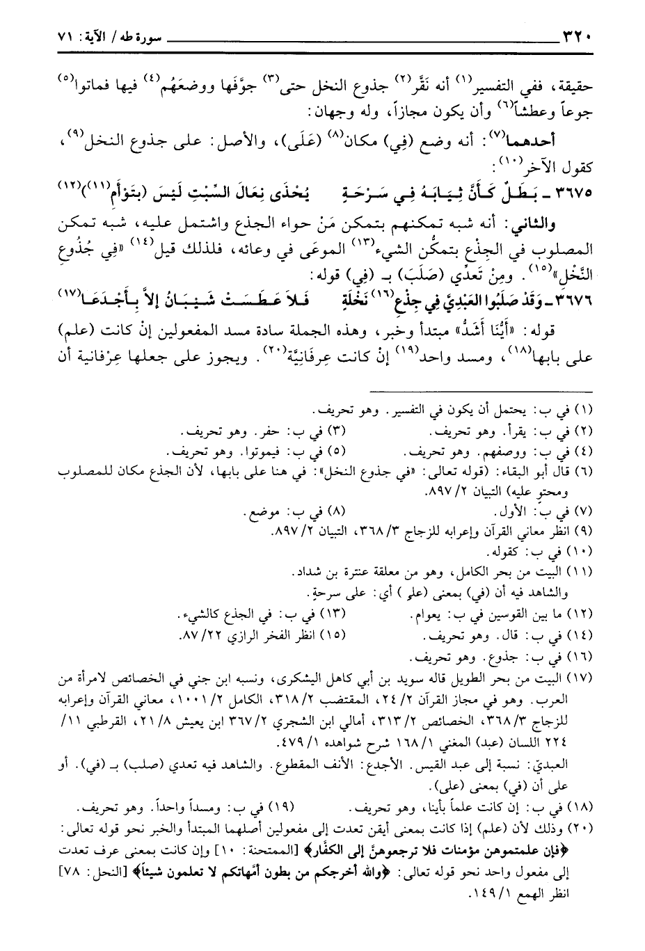 والثاني: أنه شبه تمكنهم بتمكن مَنْ حواء الجذع واشتمل عليه، شبه تمكن المصلوب في الجِذْعِ بتمكُّن الشيء الموعَى في وعائه، فلذلك قيل «فِي جُذُوعِ النَّخْلِ» . ومِنْ تَعدِّي (صَلَبَ) ب (فِي) قوله: