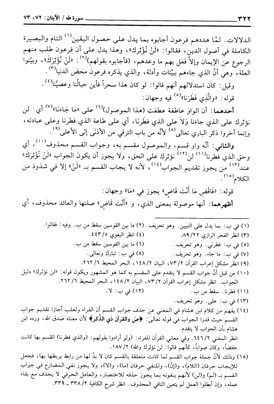الدلالات. لمَّا هددهم فرعون أجابوه بما يدل على حصول اليقين التام والبصيرة الكاملة في أصول الدين، فقالوا: «لَنْ نُؤْثِرَكَ» ، وهذا يدل على أن فرعون طلب منهم الرجوع عن الإيمان وإلاَّ فَعَل بهم وما وعدهم، (فأجابوه بقولهم) : «لَنْ نُؤْثِرَكَ» ، وبيَّنوا العلة، وهي أنَّ الذي جاءهم ببينِّات وأدلة، والذي يذكره فرعون محض الدنيا.