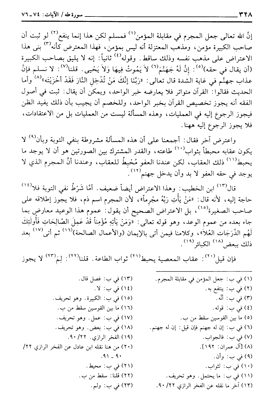 قال ابن الخطيب: وهذا الاعتراض أيضاً ضعيف. أمَّا شَرْطُ نفي التوبة فلا حاجة إليه، لأنه قال: {مَن يَأْتِ رَبَّهُ مُجْرِماً} ، لأن المجرم اسم ذم، فلا يجوز إطلاقه على صاحب الصغيرة، بل الاعتراض الصحيح أن يقول: عموم هذا الوعيد معارض بما جاء بعده من عموم الوعد، وهو قوله تعالى: {وَمَن يَأْتِهِ مُؤْمِناً قَدْ عَمِلَ الصالحات فأولئك لَهُمُ الدرجات العلى} ، وكلامنا فيمن أتى بالإيمان (والأعمال الصالحة) ثم أتى بعد ذلك ببعض الكبائر.